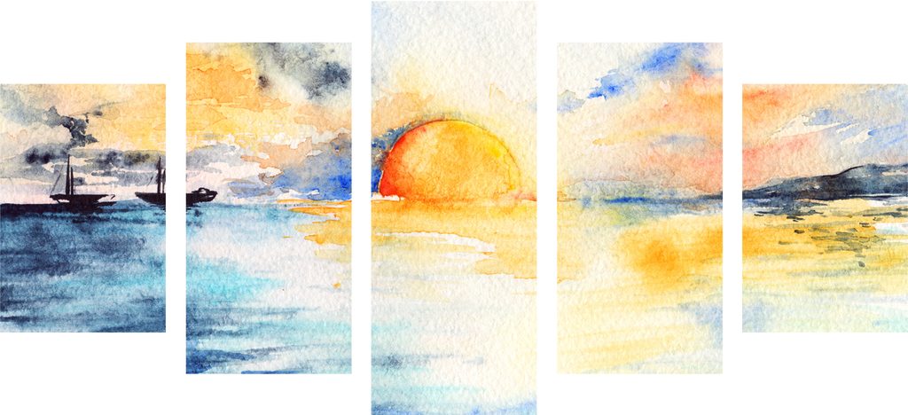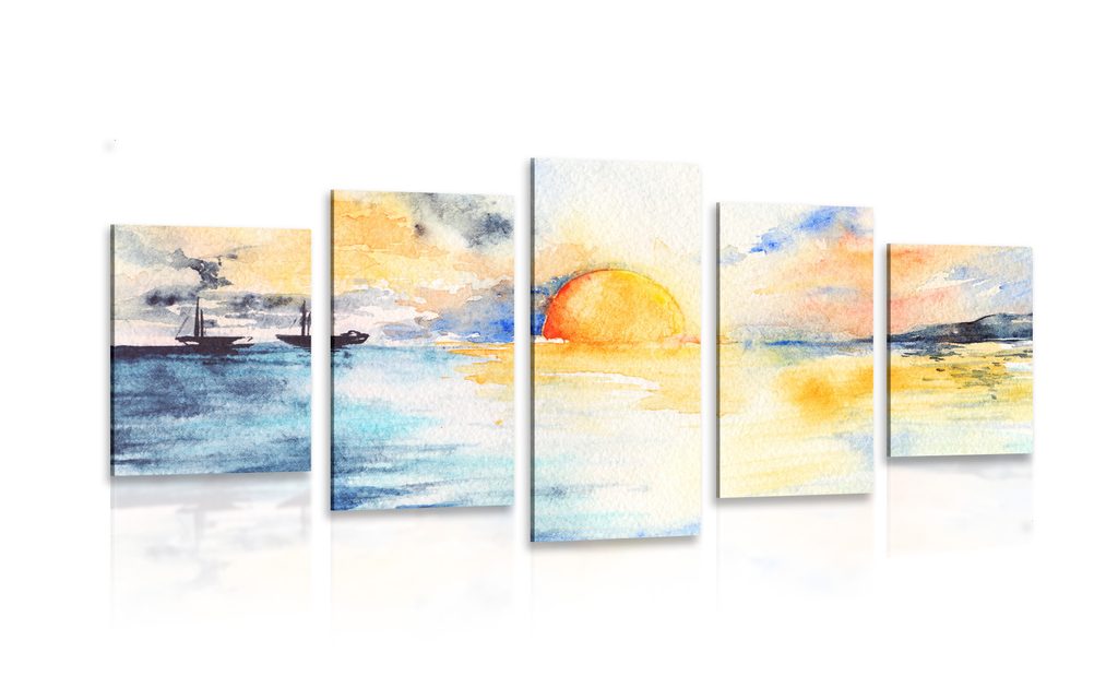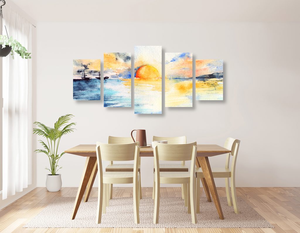 Objevte krásu zářivého západu slunce u moře v tomto jedinečném 5-dílném obraze. Motiv zachycuje nádhernou scenérii s plachetnicemi na klidné vodě, zatímco slunce zapadá na horizontu. Teplé odstíny oranžové, žluté a modré vytvářejí harmonickou atmosféru, která vnese do vašeho interiéru klid a pohodu. Tento obraz je ideální volbou pro obývací pokoje, ložnice nebo kanceláře, kde dodá prostoru elegantní nádech. Vyrobeno z kvalitních materiálů, tento obraz je zárukou dlouhé životnosti a stálosti barev.