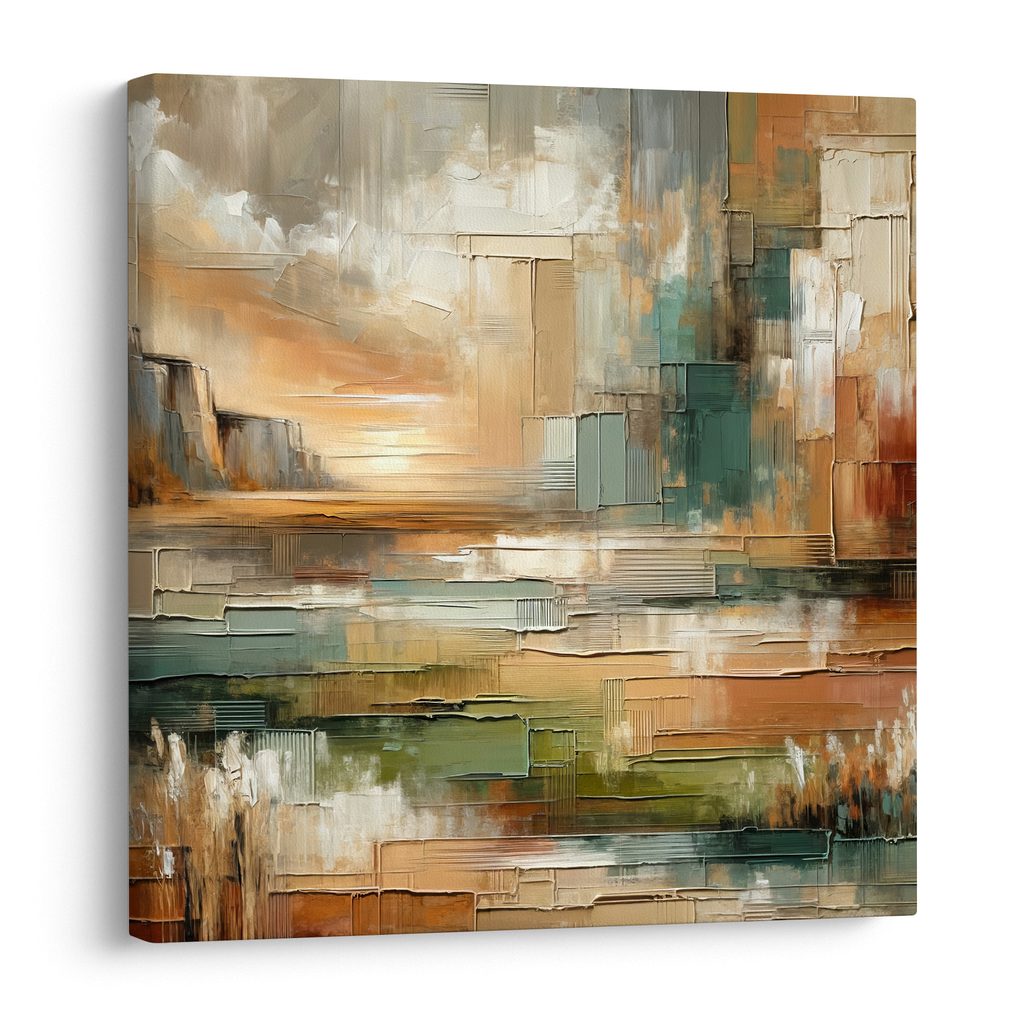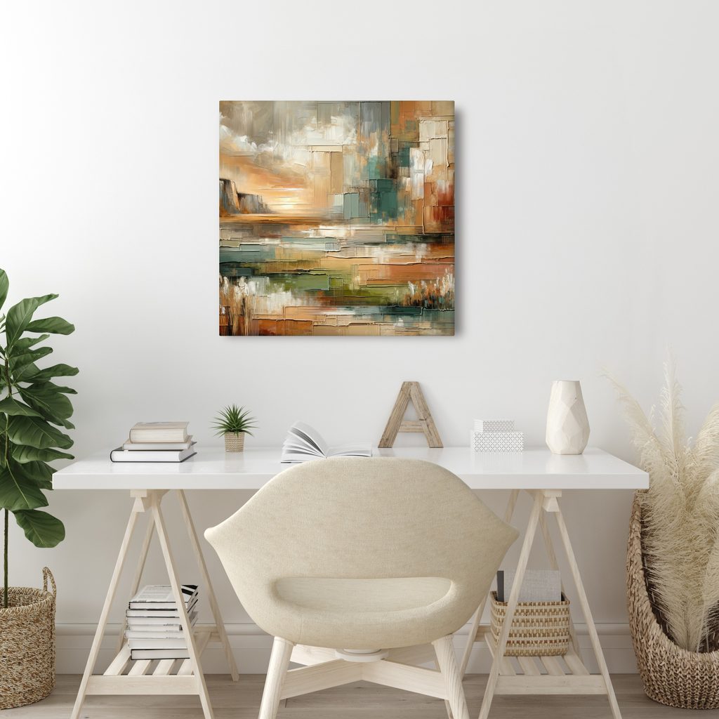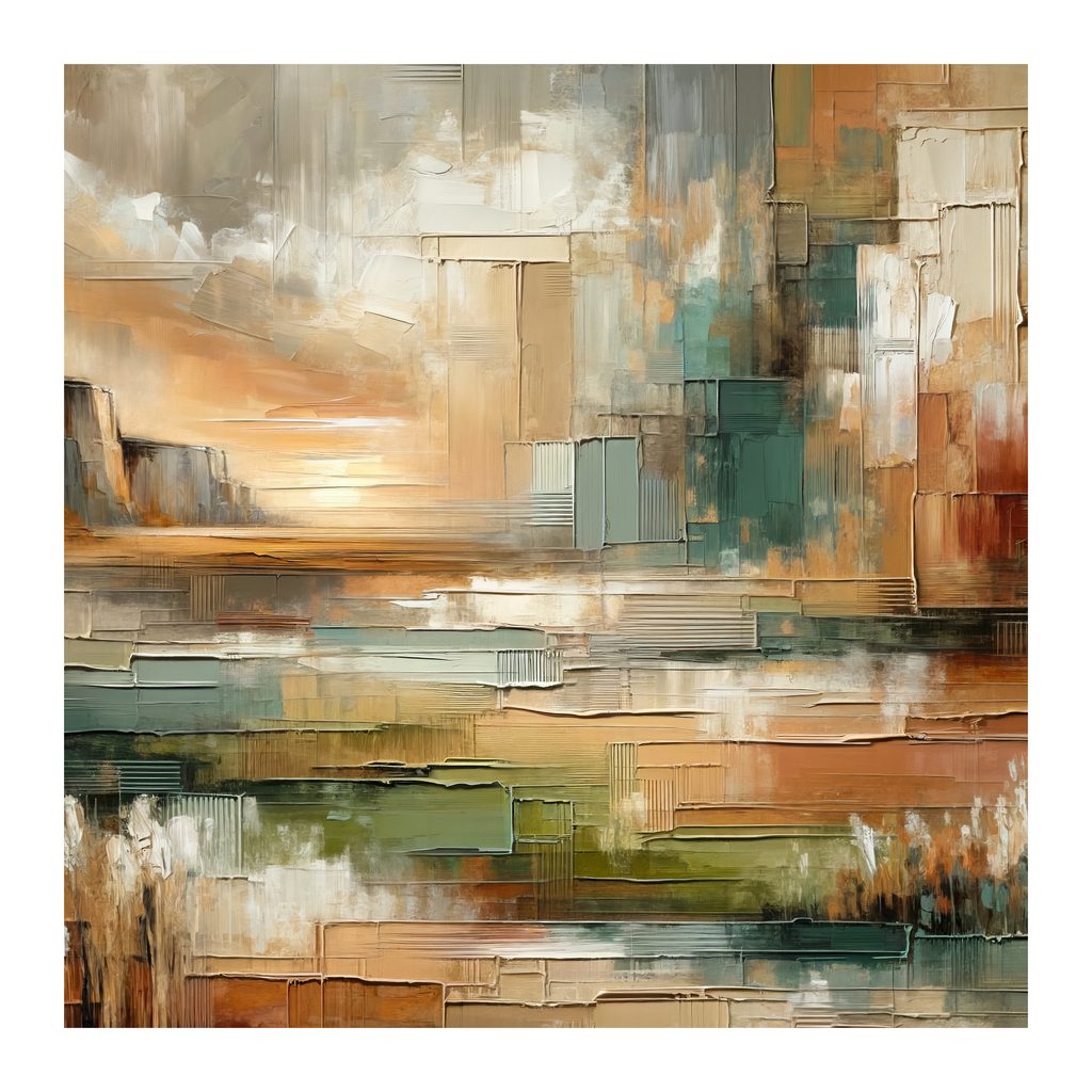Abstraktní obraz zachycující kouzlo západu slunce. V motivu se prolínají jemné odstíny oranžové, zelené a béžové, vytvářející harmonickou atmosféru. Textury a vrstvy dodávají dílu hloubku a dynamiku, čímž posilují jeho vizuální přitažlivost. Tento obraz skvěle doplní moderní interiéry a přinese do prostoru klidnou energii. Kvalitní materiály zaručují dlouhou životnost a stálost barev.