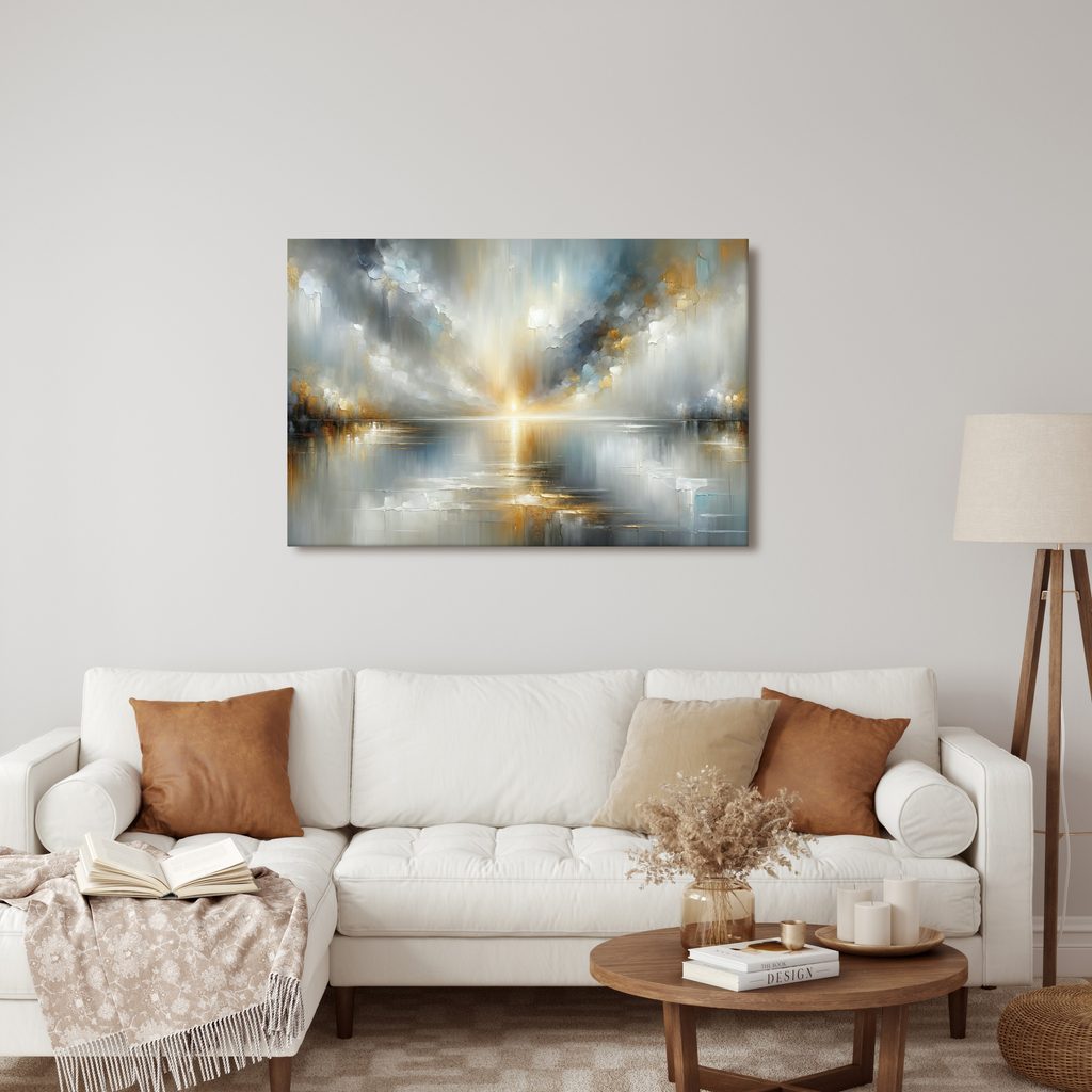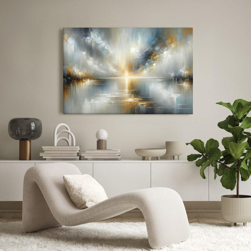 Obraz zlaté světlo nad obzorem zachycuje nádherný pohled na východ nebo západ slunce nad klidnou hladinou vody. Detaily zahrnují jemné přechody barev a abstraktní tvary, které vytvářejí dojem hloubky a pohybu. Dominují zde zlaté, modré a šedé tóny, které navozují uklidňující a harmonickou atmosféru. Tento obraz se skvěle hodí do obývacího pokoje nebo kanceláře, kde dodá prostoru eleganci a útulnost. Vyroben s důrazem na kvalitu, zajistí dlouhou životnost a krásu každého interiéru.