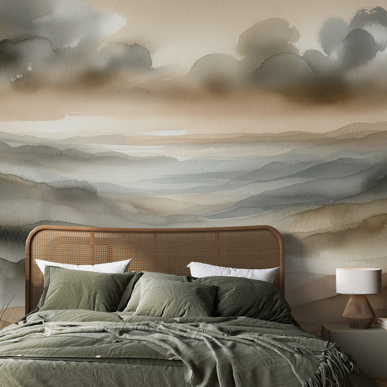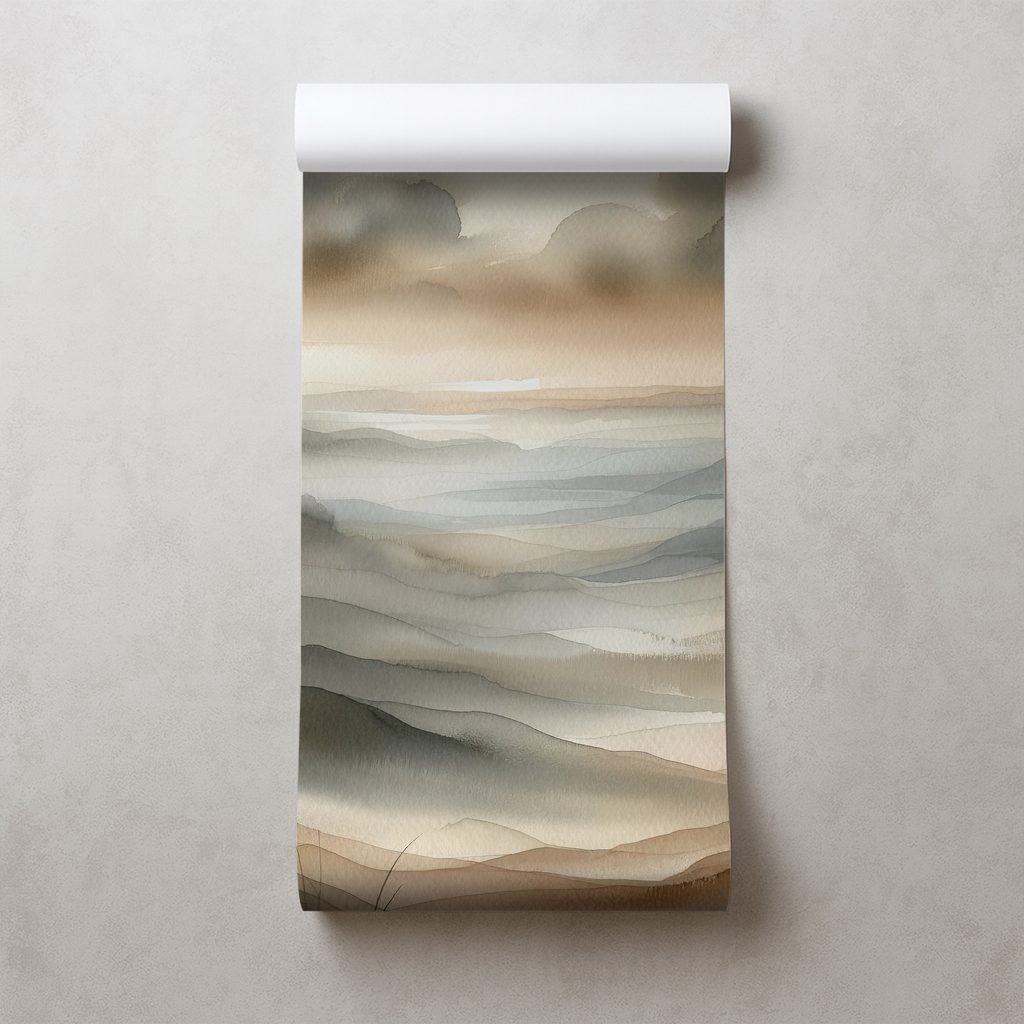 Akvarelová tapeta zobrazuje mystickou krajinu zahalenou v mlze. Jemné vrstvy horizontálních linií se prolínají v odstínech šedé, hnědé a béžové, vytvářející dojem hloubky a klidu. Atmosféra působí uklidňujícím a tajemným dojmem, ideálním pro relaxační prostory. Tato tapeta je skvělou volbou pro obývací pokoj, ložnici nebo kancelář, kde dodá eleganci a sofistikovanost. Vyrobena z kvalitních materiálů, zaručuje dlouhou životnost a snadnou aplikaci.