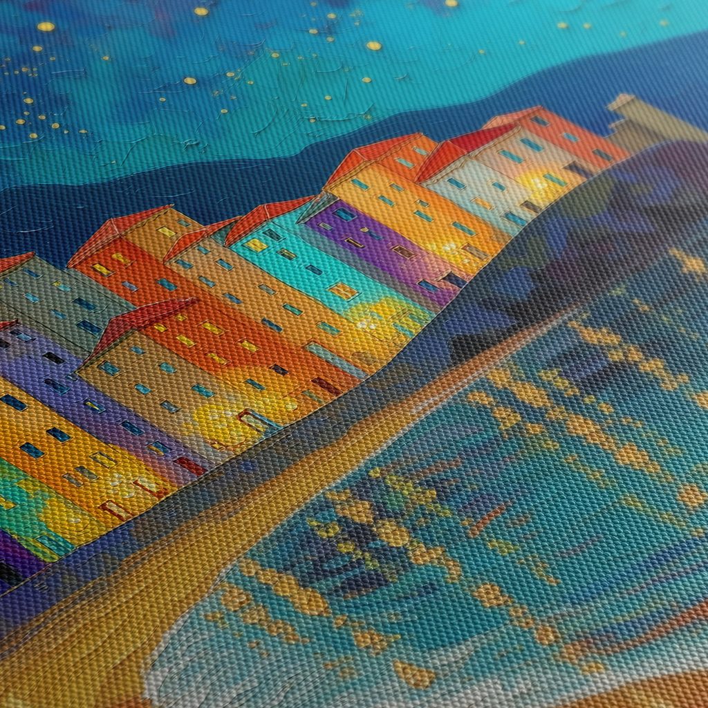 OBRAZ NOČNÍ MĚSTO U MOŘE - BAREVNÉ DOMY - OBRAZY