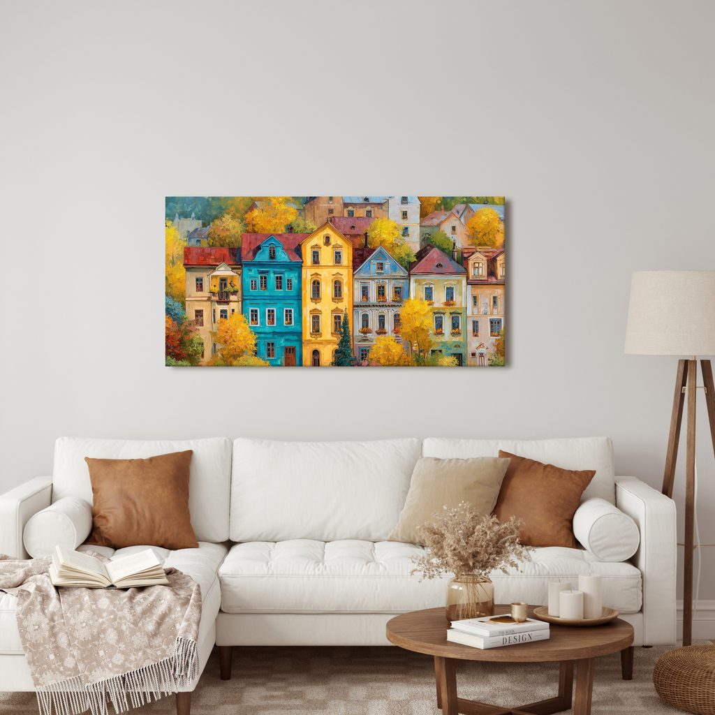 OBRAZ MĚSTSKÁ ULICE S DOMY - BAREVNÉ DOMY - OBRAZY