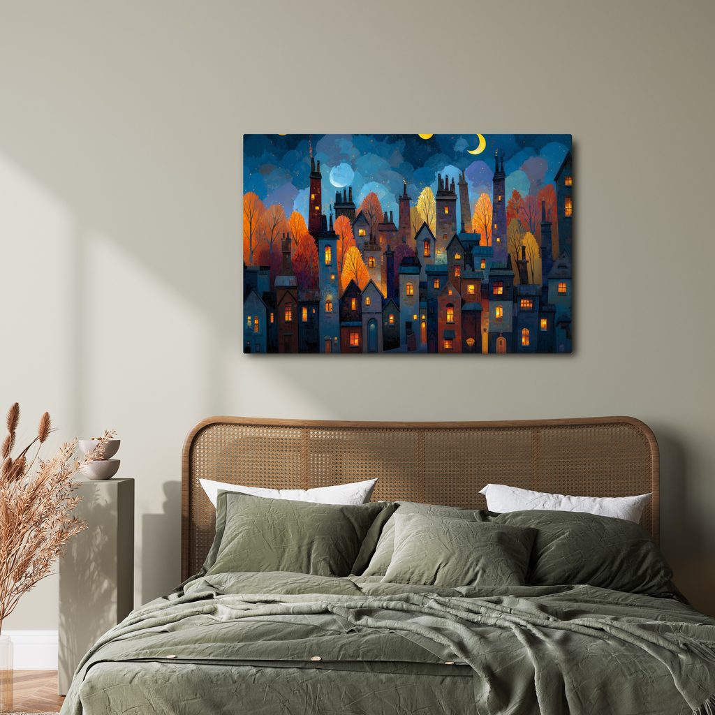 OBRAZ VEČERNÍ MĚSTSKÁ SCENÉRIE - BAREVNÉ DOMY - OBRAZY