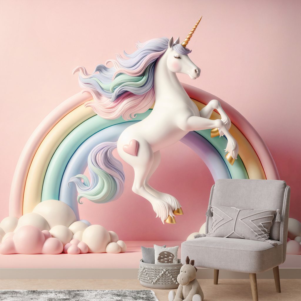 Pastelový jednorožec skáče přes duhu, což vytváří kouzelnou atmosféru. Motiv je obklopen jemnými obláčky a pastelovými barvami, které přinášejí pocit hravosti a radosti. Růžové pozadí podtrhuje celkovou jemnost a romantiku designu. Tato tapeta je ideální pro dětské pokoje nebo kreativní prostory, kde podpoří fantazii. Samolepící fototapeta je snadno aplikovatelná a má vysokou kvalitu, což zajišťuje dlouhou životnost.