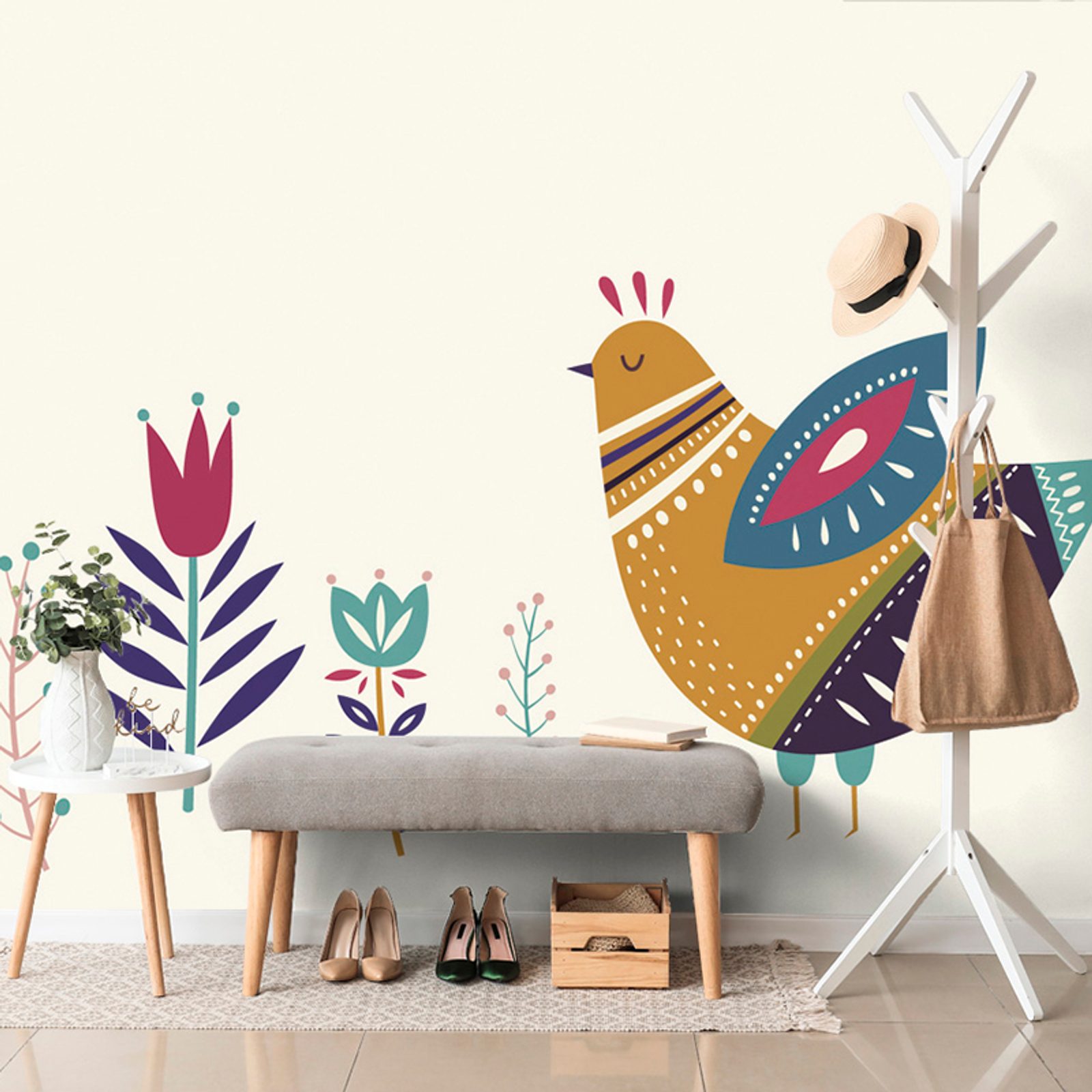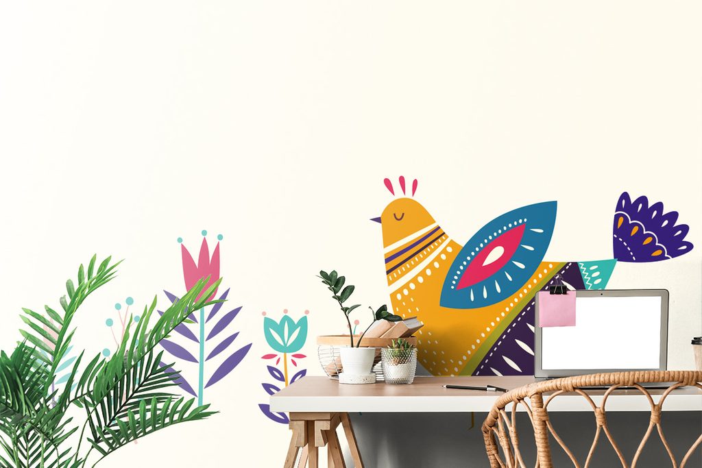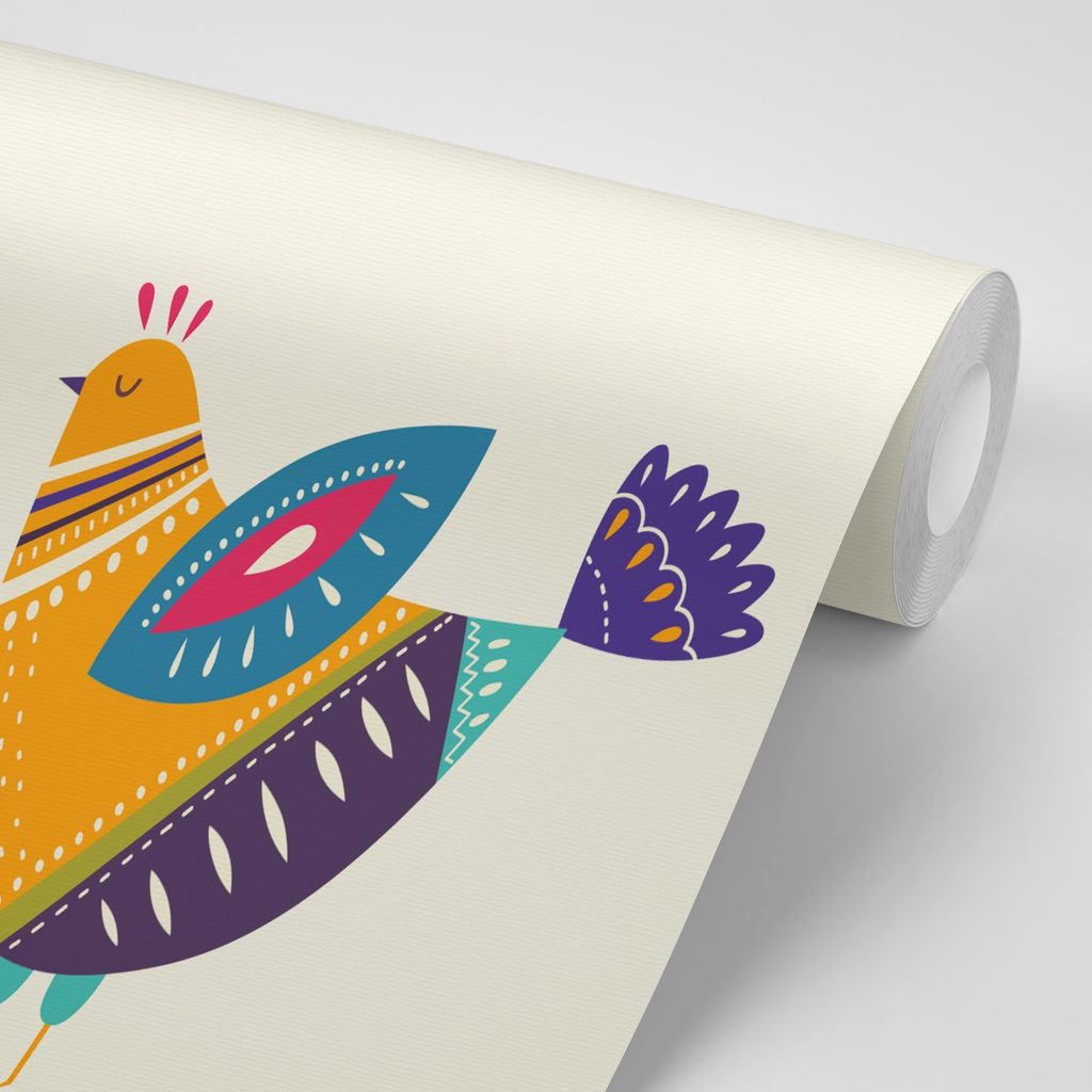Tapeta s přírodním motivem v lidovém stylu přináší do vašeho interiéru veselost a hravost. Hlavním prvkem je barevná ptáček obklopený stylizovanými květinami, které dodávají tapetě romantický nádech. Dominantní barvy jako oranžová, fialová a zelená vytvářejí příjemnou a útulnou atmosféru. Tato tapeta je ideální pro dětské pokoje, kuchyně nebo obývací prostory, kde chcete povzbudit kreativitu. Kvalitní materiál zajišťuje dlouhou životnost a snadnou aplikaci.