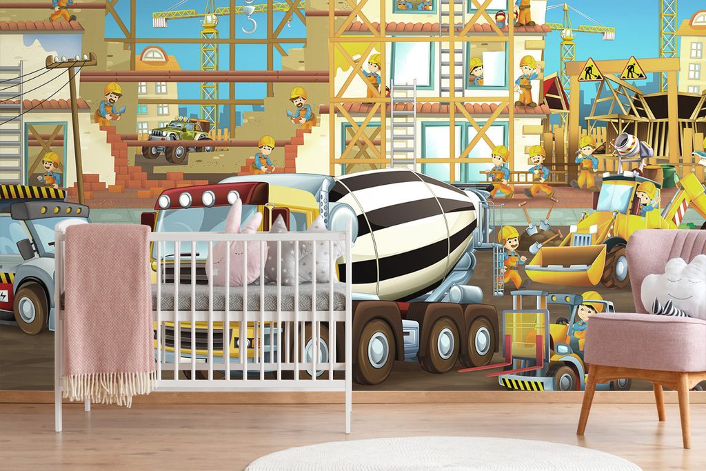 Tapeta s motivem staveniště přenese atmosféru rušného pracovního dne přímo do vašeho interiéru. Dominují jí barevné stroje jako betonové míchačky, buldozery a nákladní auta, obklopené pracovníky v helmicích. Vesele žluté, modré a hnědé odstíny dodávají prostoru energii a hravost. Ideální do dětských pokojů nebo kreativních pracovních prostorů, kde povzbudí fantazii a kreativitu. Tapeta je vyrobena z kvalitního materiálu, který zajišťuje trvanlivost a snadnou aplikaci.