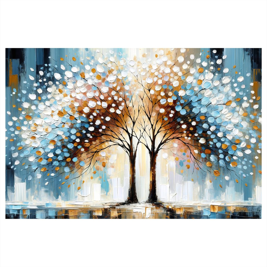 Obraz "Kouzlo stromu života" zobrazuje dva majestátní stromy s bohatou korunou. Detaily listů v modré, bílé a zlaté barvě vytvářejí harmonickou kompozici, která přitahuje pozornost. Celková atmosféra obrazu je svěží a pozitivní, evokující pocit klidu a pohody. Tento obraz je ideální volbou pro ozdobení obývacího pokoje nebo pracovny, kde přinese nádech elegance. Kvalitní tisk na plátno zaručuje dlouhou životnost a jasnost barev, které oživí každý interiér.
