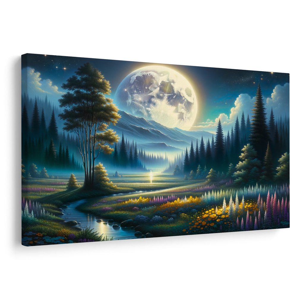 Obraz magického údolí při svitu měsíce zachycuje kouzelnou krajinu plnou života a barev. Dominantou je jasně osvětlený měsíc, který vrhá své odrazy na klidnou řeku a obohacuje scenérii o tajemnou atmosféru. Pestré květiny a majestátní stromy se prolínají s tmavými siluetami hor, což vytváří harmonický kontrast. Tento obraz je ideální pro ty, kteří chtějí přidat do svého interiéru nádech magie a klidu. Vyrobeno z kvalitních materiálů, zaručuje dlouhou životnost a výraznost barev.