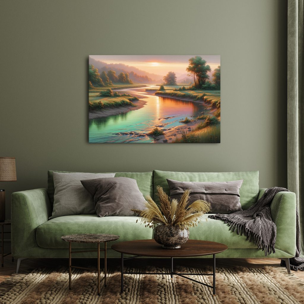 Tento obraz zachycuje klidnou řeku v podvečerním světle, obklopenou bujnou přírodou. Detaily zahrnují jemně se vlnící vodu, zelené břehy a stromy, které vytvářejí harmonickou scenérii. Barvy jsou teplé a uklidňující, s odstíny oranžové a zelené, které evokují pocit pohody a klidu. Tento motiv je ideální pro zkrášlení obývacího pokoje nebo pracovny, přináší do interiéru přírodní krásu. Obraz je vytištěn na kvalitním plátně, což zajišťuje jeho dlouhou životnost a estetický vzhled.