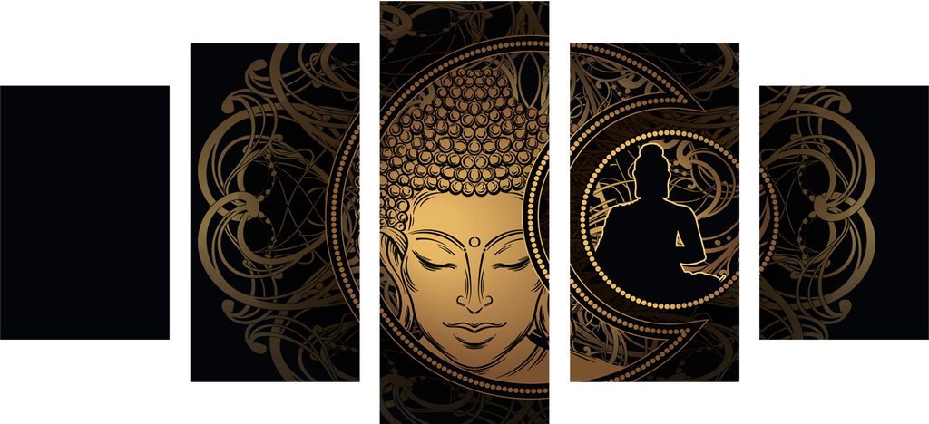 Sada pěti obrazů s motivem Buddhy přináší harmonickou sílu a klid do vašeho interiéru. Kresba zlatého Buddhy je obklopena jemnými ornamenty, které dodávají pocit elegance a spirituality. Dominují zde tmavé a zlaté odstíny, které vytvářejí útulnou a meditační atmosféru. Tento obraz je ideální pro obývací pokoj nebo pracovnu, kde podpoří vaši koncentraci a relaxaci. Obrazy jsou vyrobené z kvalitního materiálu s dlouhou životností a snadnou údržbou.