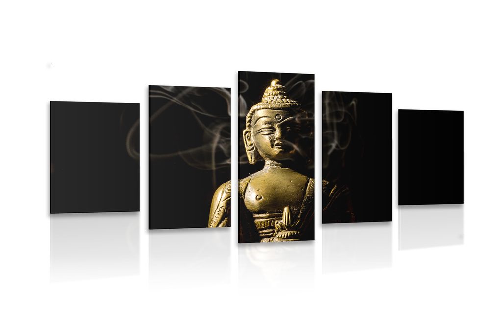 Tento 5-dílný obraz zobrazuje sochu Buddhy, která vyzařuje klid a harmonii. Detaily sochy jsou zachyceny s důrazem na její zlatou barvu, zatímco pozadí je temné a tajemné, doplněné jemným kouřem. Kombinace barev vytváří atmosféru meditace a duchovního růstu. Tento obraz je ideální volbou pro zklidnění prostoru v obývacím pokoji nebo pracovně. Kvalita tisku zajišťuje živé barvy a dlouhou životnost, což z něj činí skvělou investici do vašeho interiéru.