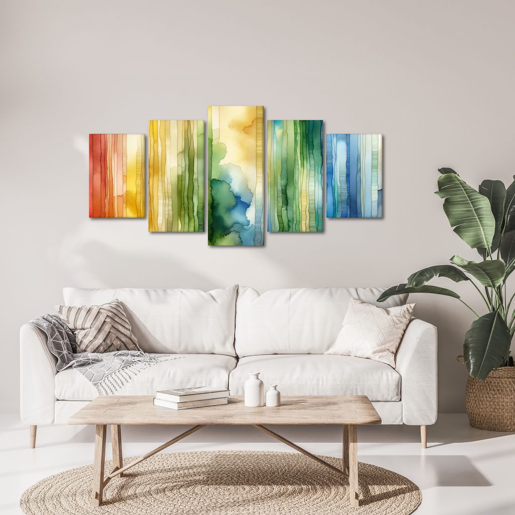 Tento 5-dílný obraz zachycuje krásu lesní harmonie. Skládá se z jemných pruhů v různých odstínech zelené, modré, žluté a červené, které evokují přírodní scenérie. Vzdušná atmosféra a měkké přechody barev vytvářejí uklidňující a harmonický pocit. Ideálně se hodí do obývacích pokojů nebo pracovních prostor, kde přinese klid a inspiraci. Obraz je vytištěn na kvalitním plátně, které zaručuje dlouhou životnost a odolnost.
