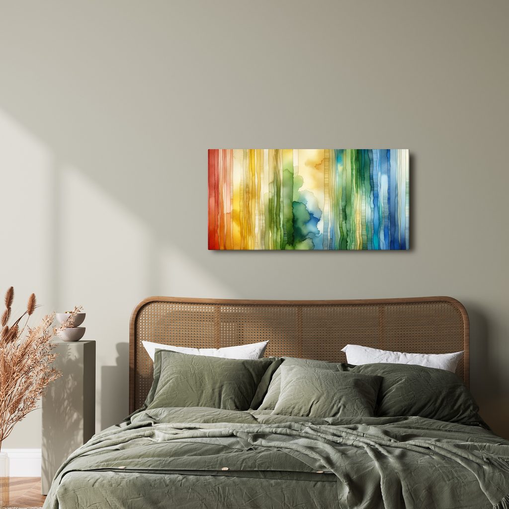 Obraz "Klid v zeleném lese" zachycuje harmonii přírody s abstraktním ztvárněním lesních prvků. Hlavními elementy jsou jemné barevné pruhy, které evokují stromy a přírodní scenérie, doplněné o měkké akvarelové detaily. Dominují zde uklidňující odstíny zelené, modré a žluté, které vytvářejí příjemnou a relaxační atmosféru. Tento obraz je ideální volbou pro zútulnění obývacího pokoje nebo pracovny. Vysoce kvalitní materiály zaručují dlouhou životnost a jasnost barev, což z něj činí perfektní doplněk do každého interiéru.