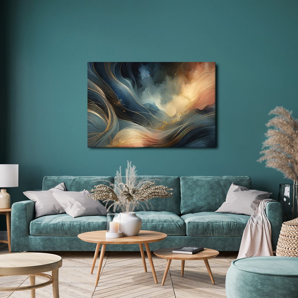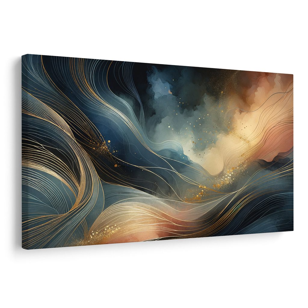 Obraz plynutí světla a tmy zachycuje harmonii kontrastních barev a pohybových linií. Vlnící se tvary v modrých a zlatých odstínech vytvářejí pocit dynamiky a elegance. Atmosféra je tajemná a snová, vyzařující klid a inspiraci. Tento obraz je ideální pro moderní interiéry, kde se stane výrazným designovým prvkem. Kvalitní zpracování zajišťuje dlouhou životnost a odolnost vůči vyblednutí.