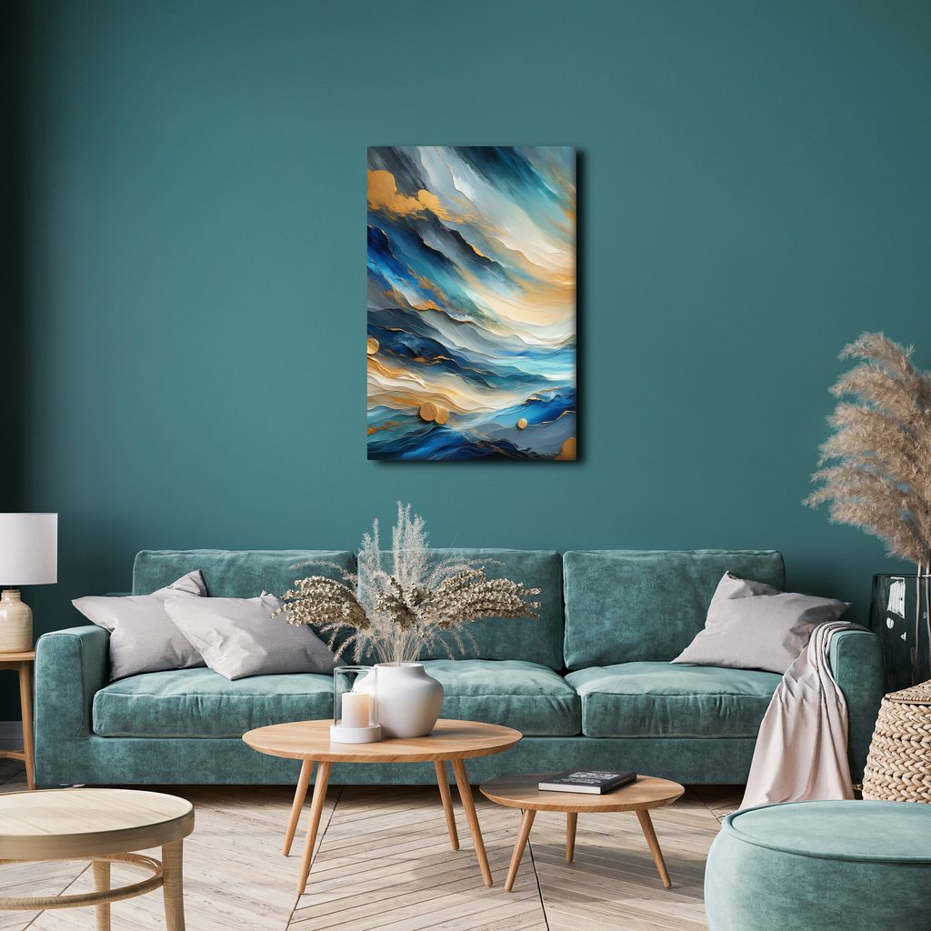 Obraz proudění barev přináší dynamiku a hloubku do vašeho interiéru. Vlnící se tvary a elegantní zlaté detaily vytvářejí harmonickou kompozici. Dominují modré a zlaté odstíny, které evokují klidnou a inspirativní atmosféru. Ideální pro obývací pokoj, kancelář nebo kreativní prostor, tento obraz osvěží každou místnost. Kvalitní zpracování a moderní design zaručují dlouhou životnost a estetickou hodnotu.