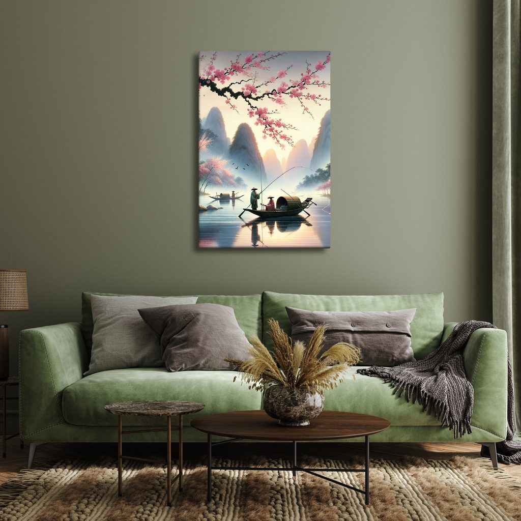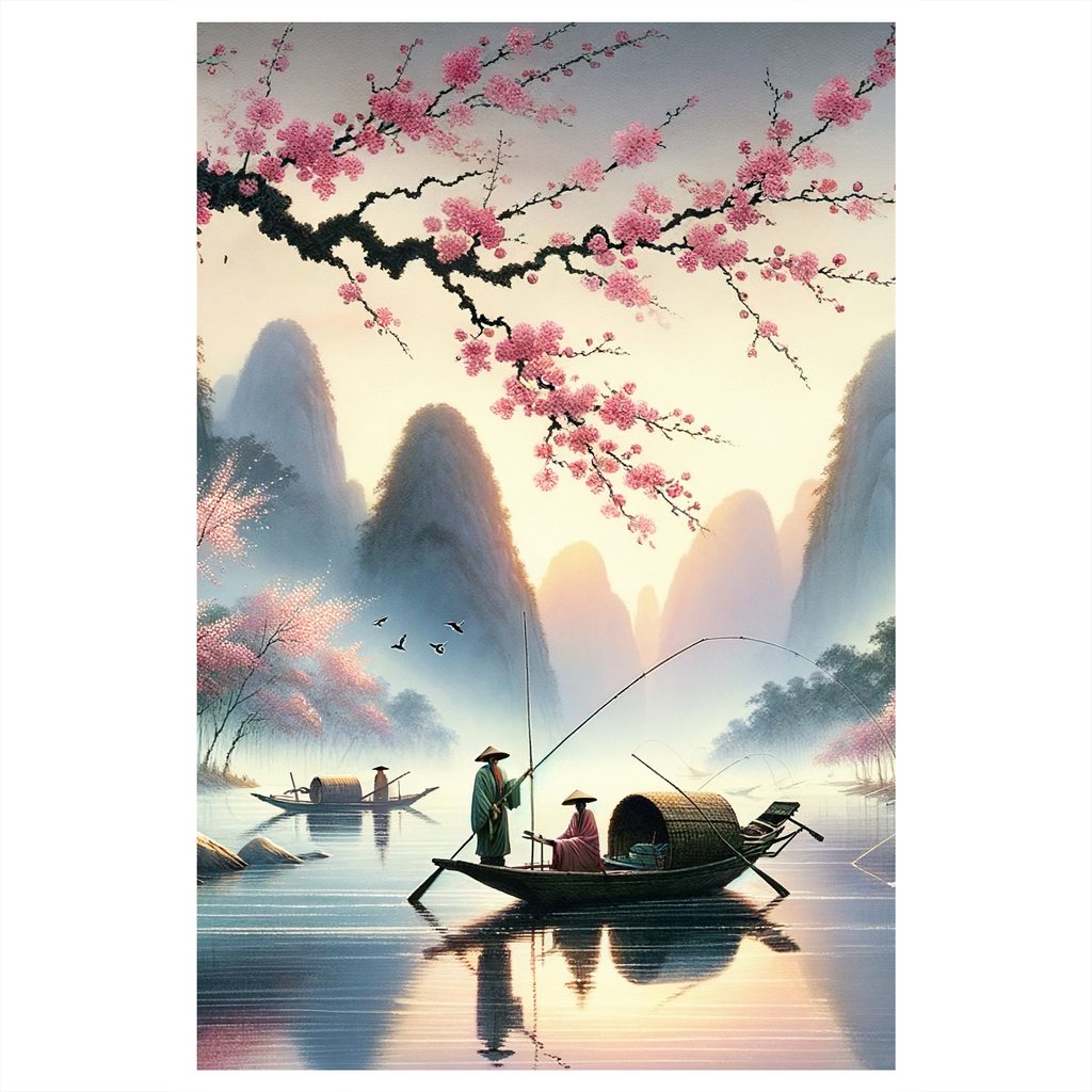 Obraz rybáři pod horami zachycuje klidnou scenérii, kde se rybáři plaví po malebné řece. Na pozadí se tyčí majestátní hory, zatímco v popředí se rozprostírá kvetoucí třešňový strom. Jemné pastelové barvy vytvářejí harmonickou atmosféru, která evokuje pocit pohody a klidu. Tento obraz je ideální pro dekoraci obývacího pokoje nebo pracovny, přináší do interiéru nádech přírody a tradice. Kvalita tisku a materiály zaručují dlouhou životnost a krásu vašeho nového uměleckého díla.