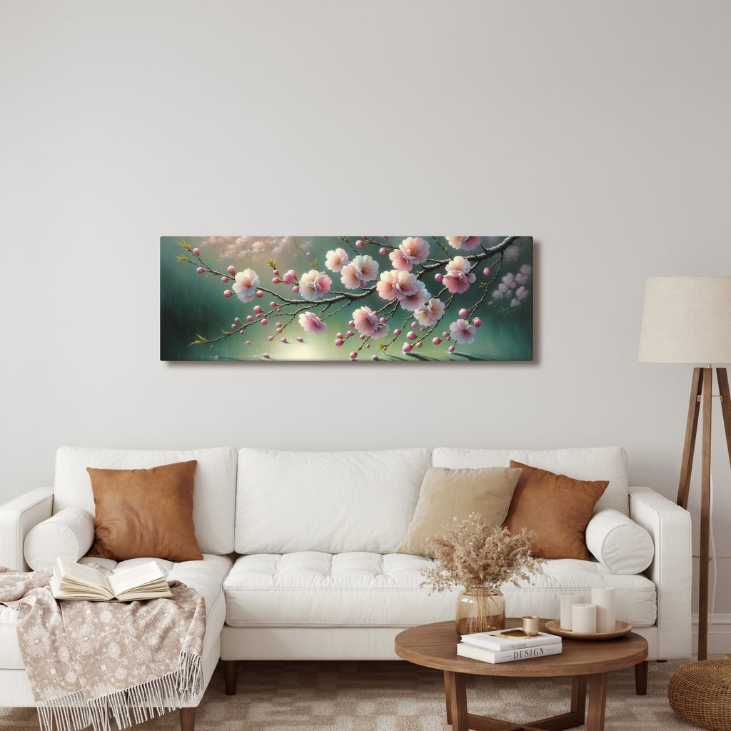 Obraz zachycuje jemné květy sakury v odlesku světla, které vytvářejí okouzlující atmosféru. Na obraze dominují růžové květy a pupeny na elegantních větvích, kontrastující s klidnou zelenou a modrou pozadí. Kombinace pastelových barev dotváří harmonickou a uklidňující náladu. Tento obraz je ideální volbou pro zkrášlení interiéru, přinese do vašeho domova pocit klidu a přírodní krásy. Vysoká kvalita tisku zajišťuje dlouhou životnost a výrazné detaily, které oživí každou místnost.