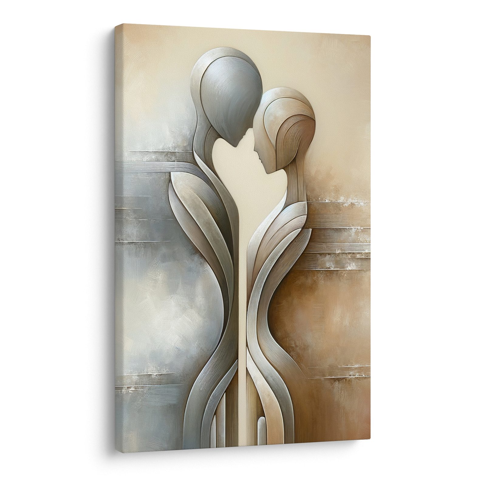 Abstraktní obraz s motivem dvou postav v blízkosti vyjadřuje intimitu a spojení. Detaily tvarů jsou elegantně propletené, což vytváří dojem harmonie. Dominantní barvy béžové, šedé a krémové dodávají dílu jemnou a klidnou atmosféru. Tento obraz je ideální pro moderní interiéry, kde podtrhne osobitý styl a pocit pohody. Obraz je vyroben z kvalitních materiálů, což zajišťuje dlouhou životnost a estetický vzhled.