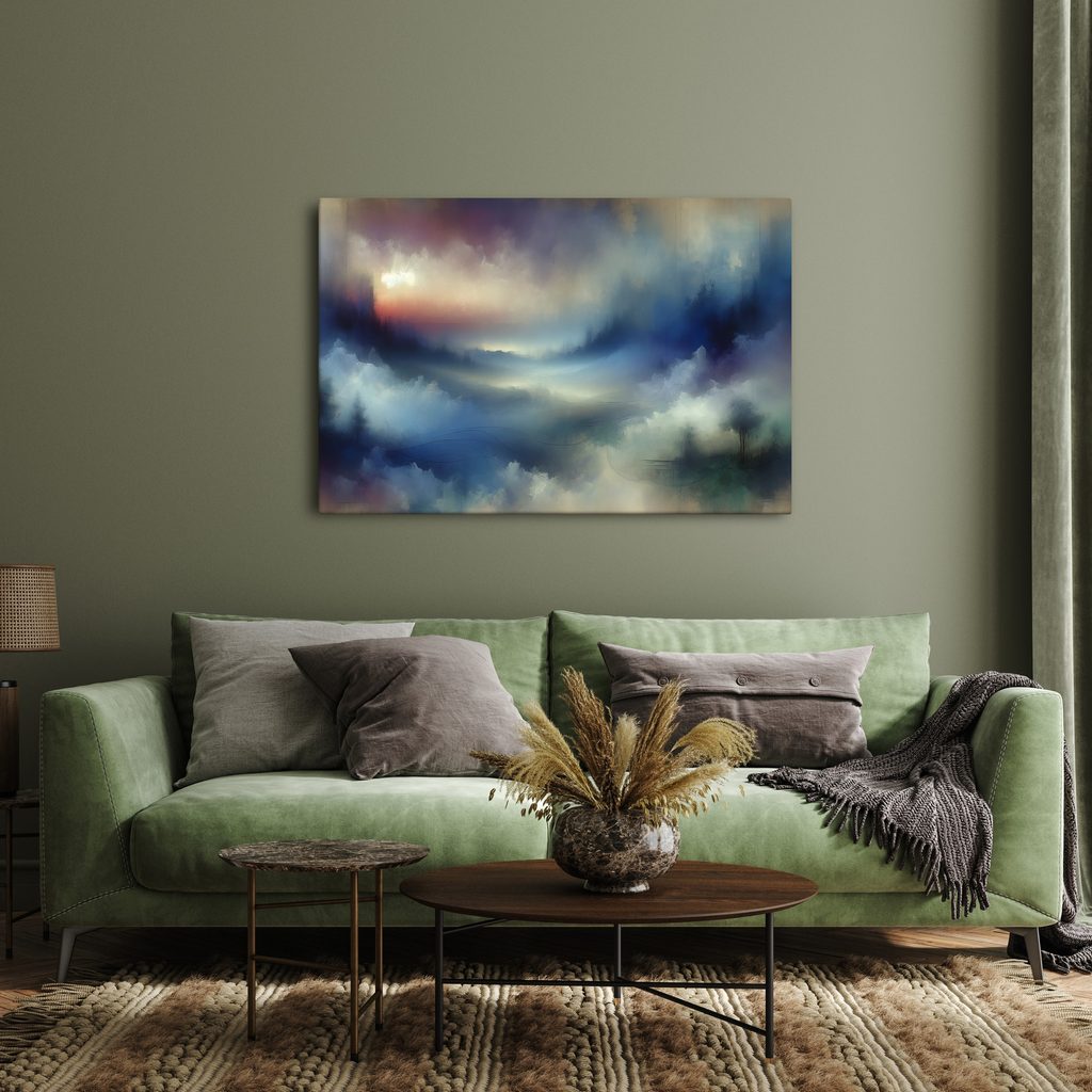 Obraz tajemného údolí přenáší diváka do mystického světa plného magie a klidu. Hlavním prvkem jsou jemné vrstvy mlhy a mraků, které se prolínají s náznaky krajiny v pozadí. Barevná paleta se skládá z modrých, fialových a zlatých odstínů, které vytvářejí atmosféru tajemství a snovosti. Tento obraz je ideální pro ty, kteří chtějí dodat svému interiéru osobitý a uklidňující prvek. Vyrobeno z kvalitních materiálů, zaručuje dlouhou životnost a stálost barev.