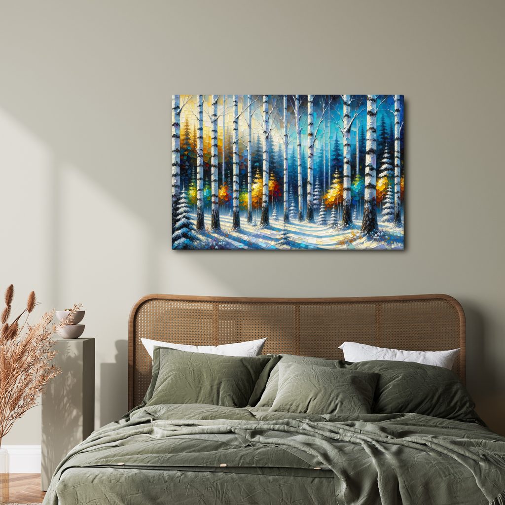 Obraz zimní lesní kouzlo zachycuje kouzelnou atmosféru zasněženého lesa. Bílé březové stromy se tyčí mezi tmavými jehličnany, zatímco barevné listy přinášejí teplé odstíny do chladného prostředí. Kombinace modrých, bílých a zlatých barev vytváří harmonickou a klidnou náladu. Tento obraz se skvěle hodí do obývacího pokoje nebo pracovny, kde přinese pocit klidu a přírodní krásy. Kvalitní tisk na plátně zaručuje dlouhou životnost a skvělou barevnou věrnost.
