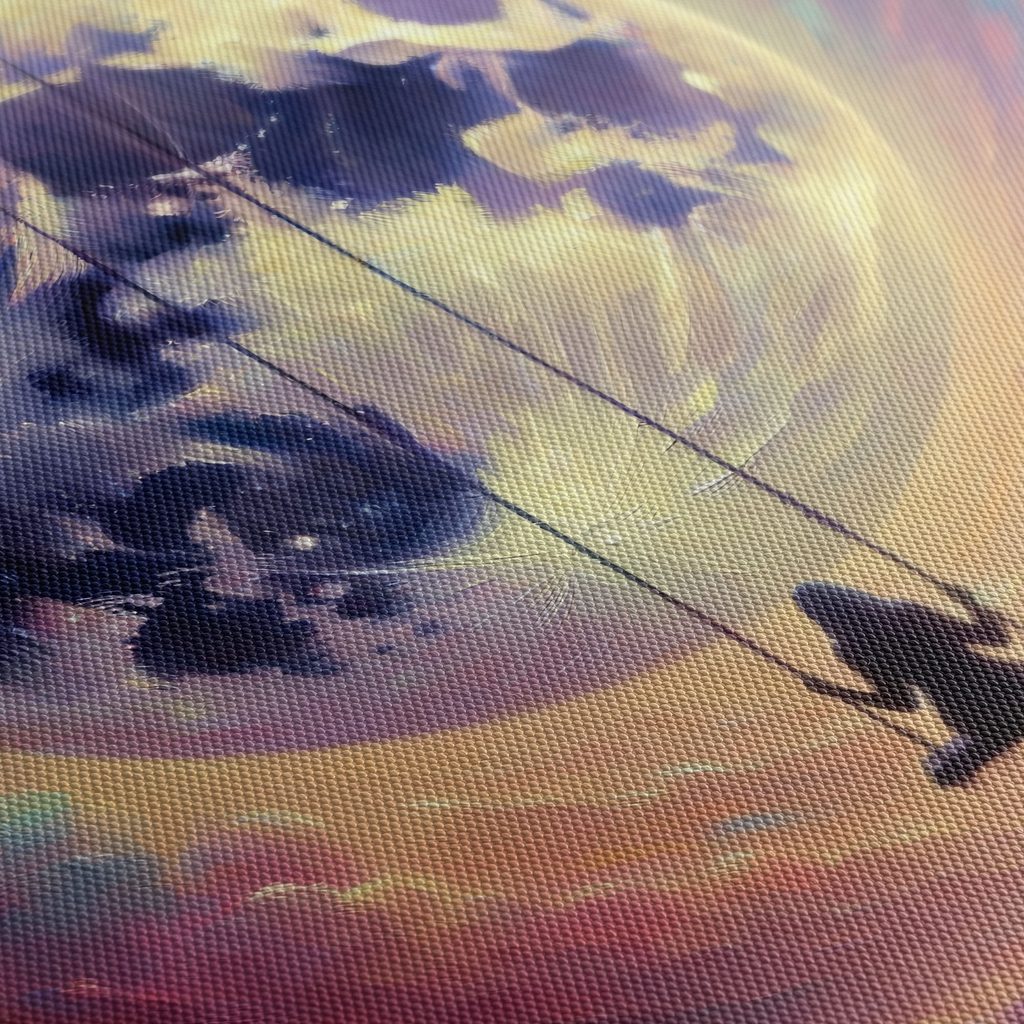 Obraz zobrazuje dívku na houpačce, která se vznáší pod velkým měsícem. Na pozadí jsou barevné obláčky a jemné přechody mezi růžovými, fialovými a modrými tóny. Atmosféra motivu je snová a romantická, evokující klid a pohodu. Tento obraz skvěle doplní jakýkoli interiér a přinese do něj kouzlo noční oblohy. Vysoce kvalitní tisk zaručuje živé barvy a dlouhou životnost.