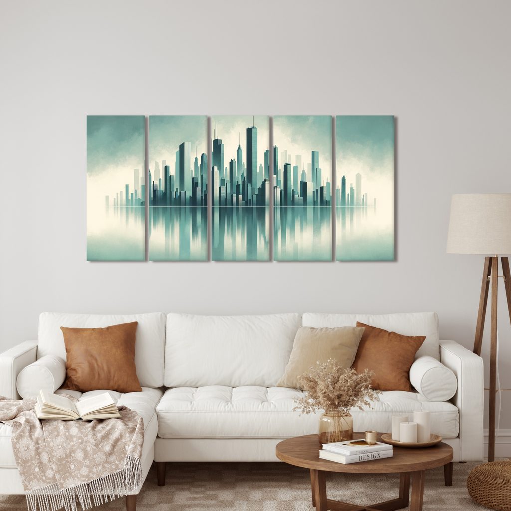 Silueta města s odrazem ve vodě přináší moderní a elegantní atmosféru. Město je zobrazeno v různých výškách, s jemnými detaily architektury, které vytvářejí působivý kontrast. Barvy převládají v odstínech modré a šedé, což dodává obrazu klidný a tajemný pocit. Tento obraz je ideální volbou pro obývací pokoje nebo pracovny, kde dodá styl a osobitost. Kvalita tisku zaručuje dlouhou životnost a jasnost barev, což přispívá k celkovému estetickému zážitku.