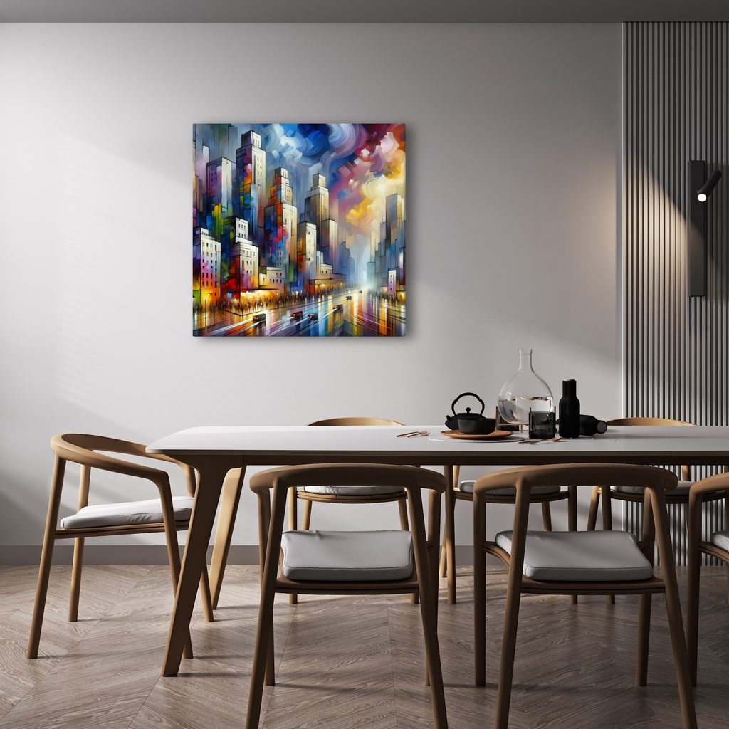 Abstraktní panorama města zachycuje živou a dynamickou atmosféru urbanistického života. Vysoké budovy jsou ztvárněny v pestrých barvách s jemnými detaily, které dodávají obrazu hloubku. Kombinace modrých, žlutých a červených odstínů vytváří harmonickou a energickou náladu. Tento obraz se skvěle hodí do moderních interiérů, kde oživí prostor a podnítí diskusi. Kvalitní provedení zaručuje dlouhou životnost a trvalý estetický dojem.