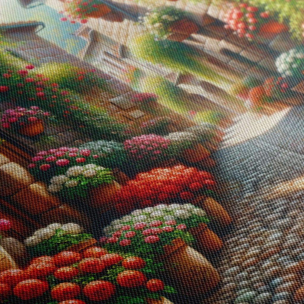 Obraz zachycuje malebnou kamennou ulici plnou květin. Ulice je lemována barevnými květinovými truhlíky, které vytvářejí živou atmosféru. Teplé a jasné barvy květin kontrastují s přírodními tóny kamene, což dodává dílu útulný pocit. Tento obraz je ideální pro oživení interiéru a přináší do vašeho domova kousek přírody. Kvalita tisku zaručuje dlouhou životnost a detailní zpracování každého prvku.