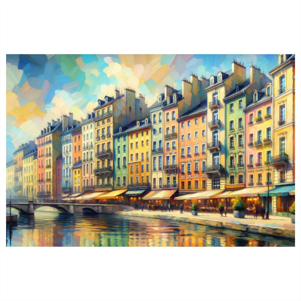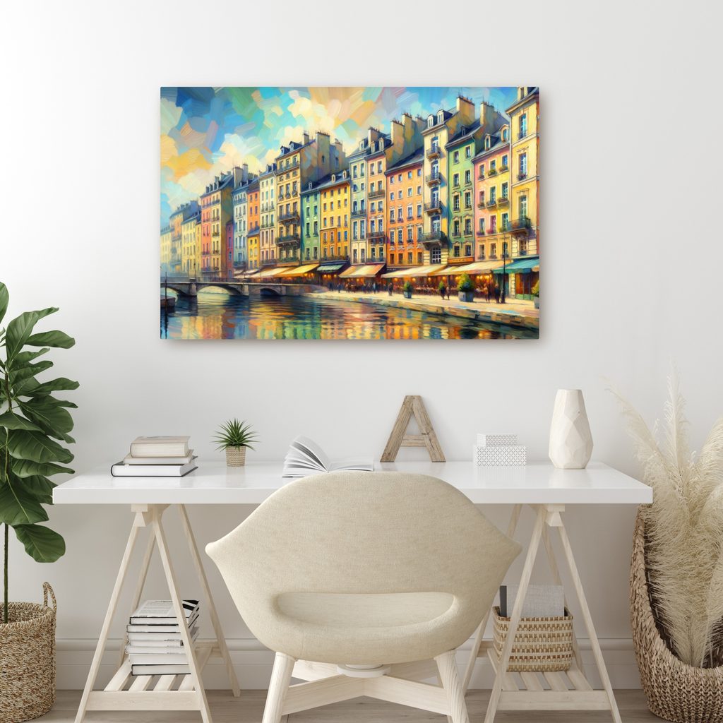Obraz městské scenérie zachycuje kouzlo městského života s malebnými budovami podél řeky. Detaily zahrnují barevné fasády domů a odrazy ve vodě, které vytvářejí harmonickou atmosféru. Syté barvy a jemné světlo dodávají obrazu živost a radost. Tento obraz je ideální pro oživení interiéru ve vašem obývacím pokoji nebo kanceláři. Kvalitní tisk na plátno zaručuje dlouhou životnost a nádherný vzhled.