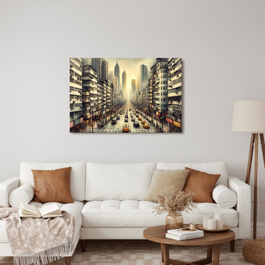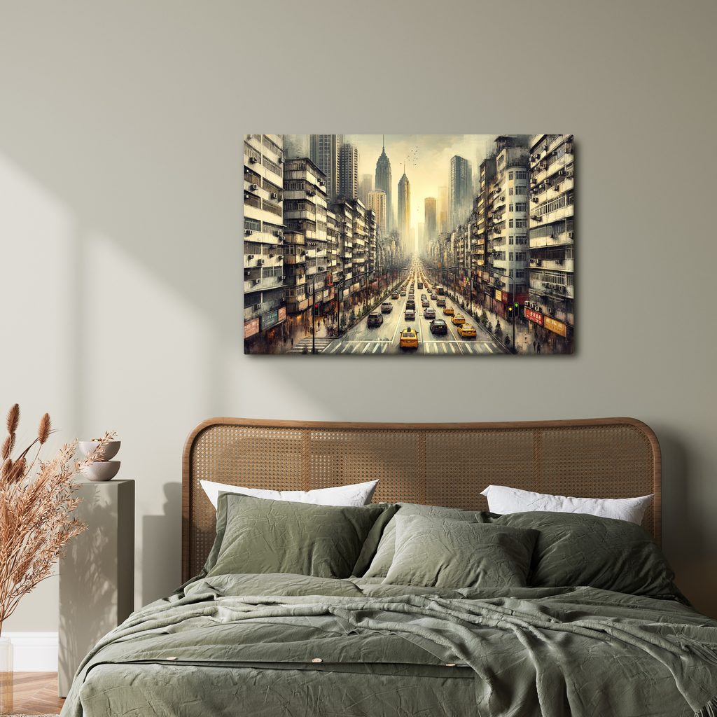 Obraz zachycuje ruchlou městskou ulici při západu slunce. Na plátně jsou detailně zobrazeny vysoké budovy a silnice plná aut, včetně ikonických žlutých taxíků. Teplé odstíny oranžové a žluté barvy přidávají atmosféru klidného večera, zatímco město pulsuje životem. Tento motiv je ideální pro moderní interiéry, které potřebují oživení. Obraz je vyroben z kvalitního materiálu, který zaručuje dlouhou životnost a stálobarevnost.