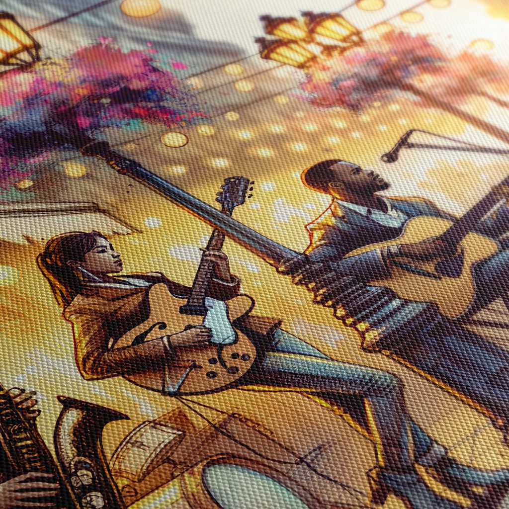 Obraz zachycuje atmosféru pouliční kapely při západu slunce. Na motivu jsou čtyři hudebníci, kteří hrají na nástroje, obklopeni kouzelným osvětlením a květinovými dekoracemi. Teplé barvy a jemné světlo vytvářejí příjemnou a romantickou náladu, ideální pro relaxaci. Tento obraz skvěle doladí jakýkoliv interiér, zejména v obytných prostorech nebo kavárnách. Kvalita tisku zaručuje živé barvy a dlouhou životnost produktu.