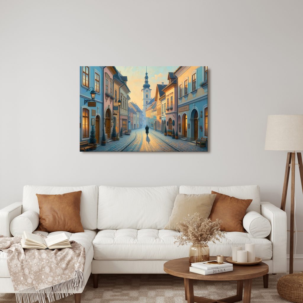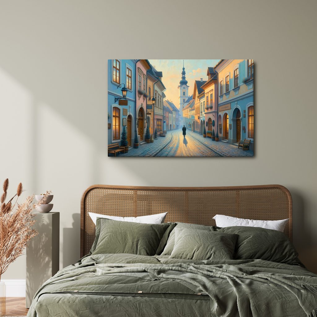 Obraz zachycuje kouzelnou procházku historickým centrem města. Na plátně se vyjímají malebné uličky s pastelovými domy, lampami a zasazenými stromy, které dodávají atmosféru klidu. Teplé odstíny oranžové a modré barvy vytvářejí příjemnou a nostalgickou náladu. Tento motiv je ideální pro oživení interiéru a dodání unikátního stylu. Obraz je vyroben z kvalitních materiálů, díky čemuž zaručuje dlouhou životnost a stálost barev.