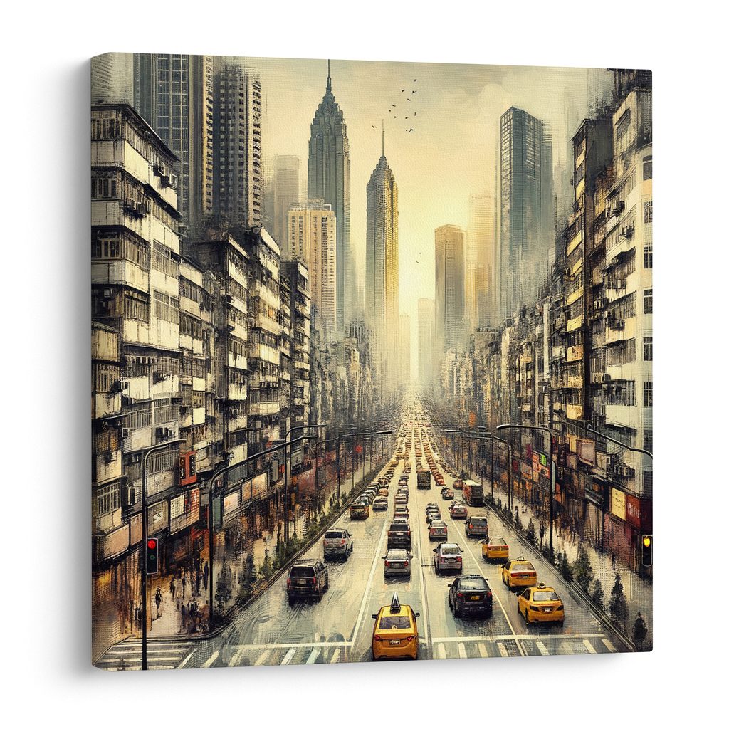 Obraz zachycuje ruch velkoměsta v podvečer, kdy se město probouzí k životu. Dominují mu vysoké moderní budovy obklopené rušnými ulicemi plnými automobilů, včetně ikonických žlutých taxíků. Teplé odstíny oranžové a zlaté vytvářejí atmosféru klidného, ale živého večera. Tento motiv je ideální pro oživení jakéhokoli interiéru, ať už doma nebo v kanceláři. Obraz je vytištěn na kvalitním plátně, což zaručuje dlouhou životnost a atraktivní vzhled.