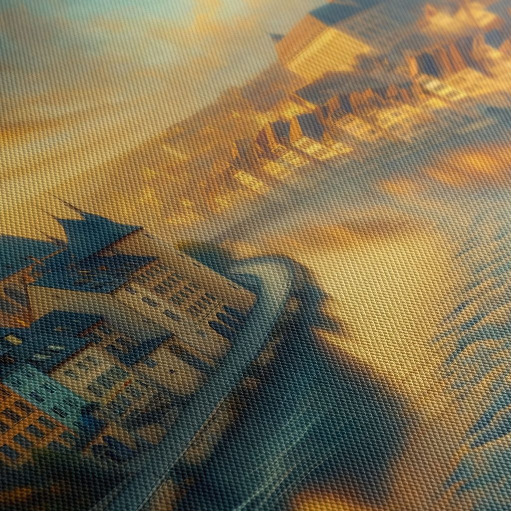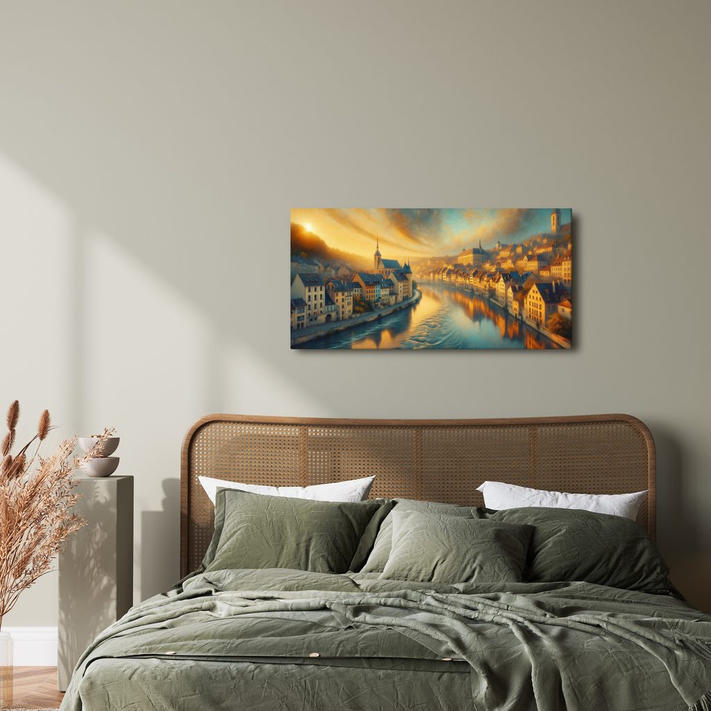 Obraz záře tichého města zachycuje malebnou scenérii městské krajiny u řeky. Na plátně se proplétají domy s typickou architekturou, osvícené teplými odstíny slunce, které se odráží v hladině vody. Atmosféra je klidná a harmonická, evokující pocit pohody a útulnosti. Tento obraz je ideální volbou pro oživení interiéru obývacího pokoje či pracovny. Kvalitní tisk na plátno zajišťuje trvanlivost a živé barvy, které ozdobí každý prostor.