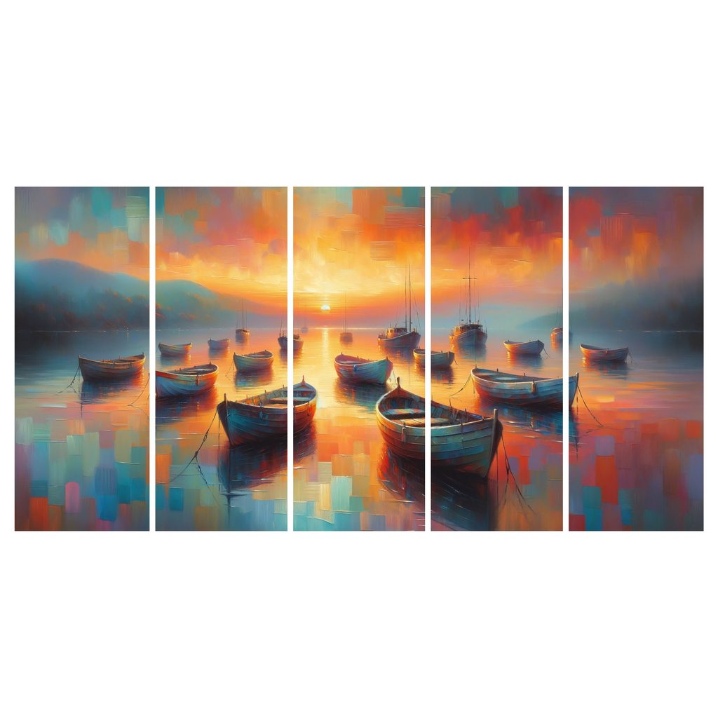 Využijte kouzlo přírody s tímto 5-dílným obrazem malebné loďky v zálivu. Obraz zachycuje klidnou hladinu s několika loďkami a nádherným západem slunce, který vytváří magickou atmosféru. Teplé barvy oranžové a modré přinášejí pocit pohody a harmonie. Ideální pro ozdobení obývacího pokoje nebo pracovny, tento obraz dodá každému prostoru osobitý nádech. Kvalitní tisk na plátno zaručuje dlouhou životnost a atraktivní vzhled.