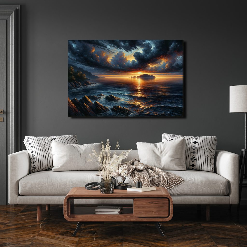 Obraz zachycuje dramatický západ slunce nad klidným mořem. Na plátně se mísí tmavé oblaky s teplými odstíny oranžové a zlaté, které odrážejí sluneční světlo na hladině vody. Atmosféra je intenzivní a tajemná, evokující pocit klidu a nádherného přírodního divadla. Tento obraz se skvěle hodí do obývacího pokoje nebo pracovny jako dominantní prvek, který zaujme každého návštěvníka. Kvalita tisku je vysoká, což zajišťuje živé barvy a dlouhou trvanlivost.
