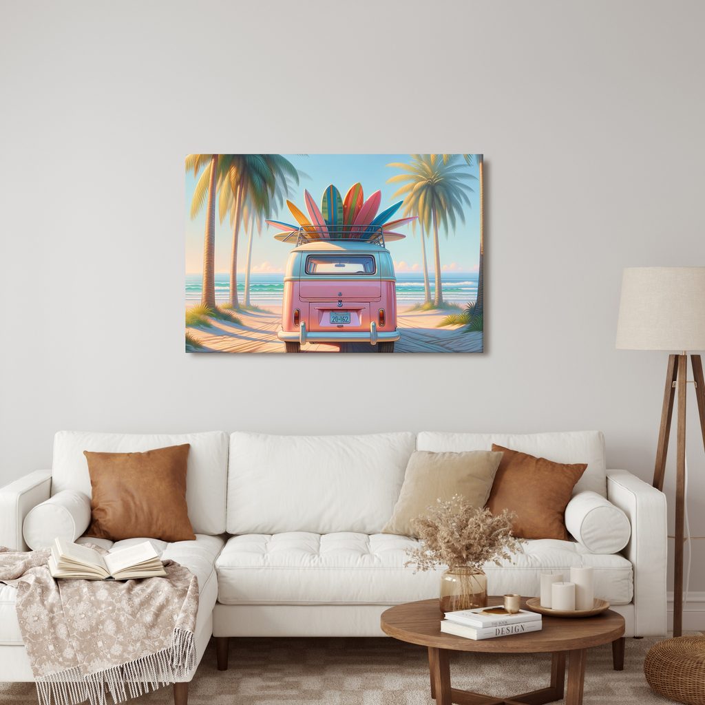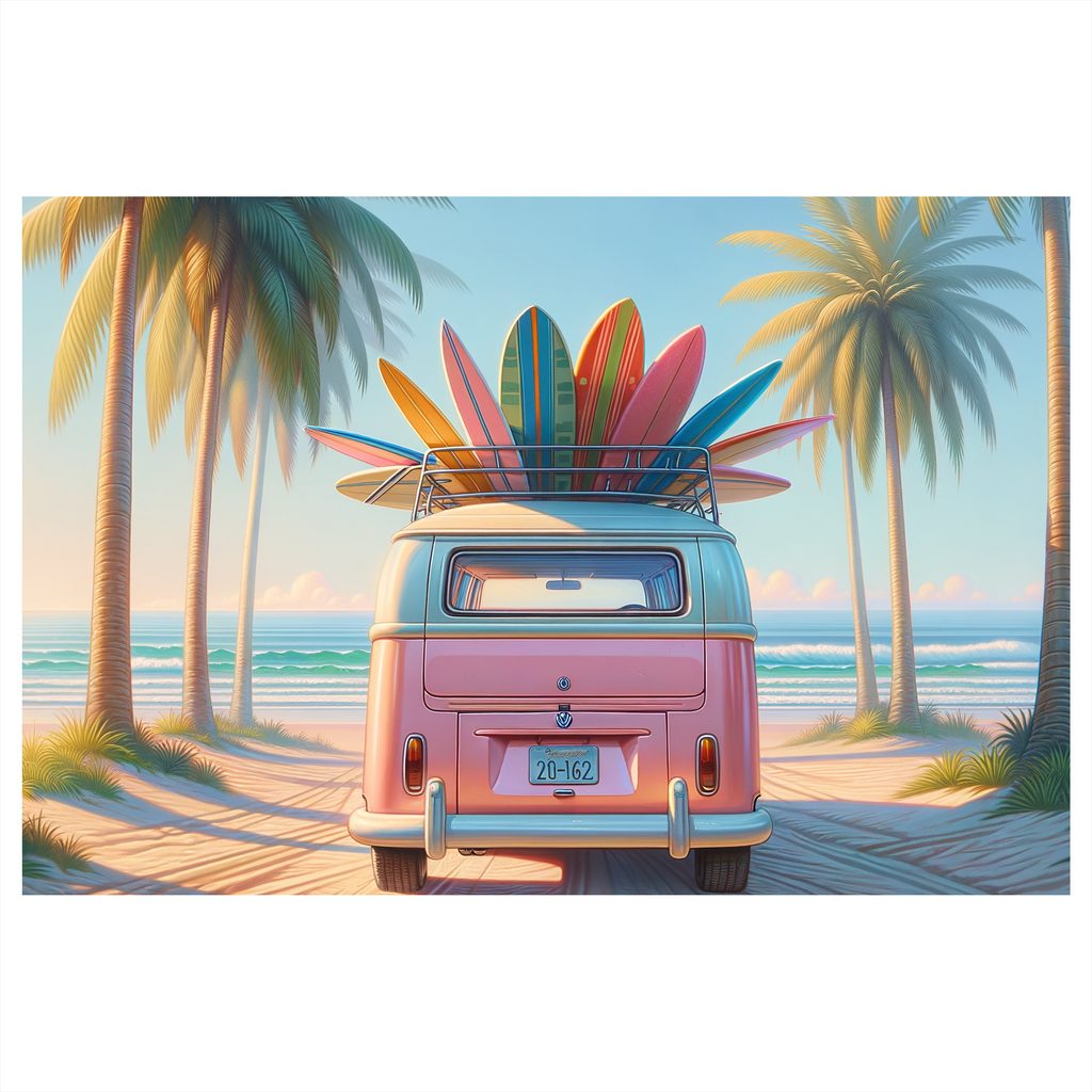 Obraz "Léto v barvách surfů" zachycuje nostalgickou atmosféru prázdnin na pláži. Hlavním prvkem je růžový dodávkový vůz s barevnými surfy na střeše, obklopený palmami a mořem. Teplé pastelové barvy vytvářejí příjemnou a uvolněnou náladu, ideální pro letní dny. Tento obraz je skvělou volbou pro výzdobu interiéru, která vnese do vašeho domova atmosféru dobrodružství a svobody. Vytvořen z kvalitních materiálů, zaručuje dlouhou životnost a sytost barev.