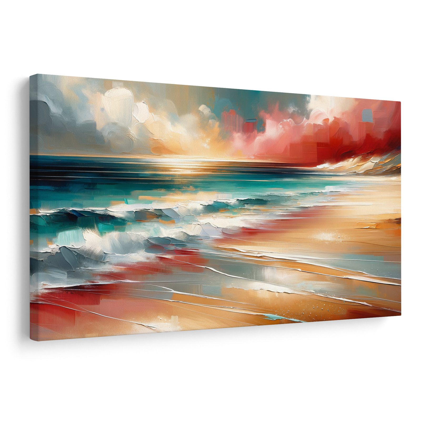 Obraz zachycuje tyrkysové moře s vlnami, které se jemně rozbíjejí o písečnou pláž. Na pozadí se odráží teplé barvy západu slunce, doplněné o dramatické mraky. Kombinace modré, zlaté a červené vytváří uklidňující, ale zároveň energickou atmosféru. Tento obraz je ideální pro oživení interiéru a dodání námořního nádechu. Kvalitní provedení zaručuje dlouhou životnost a odolnost barev, které zůstanou syté po mnoho let.