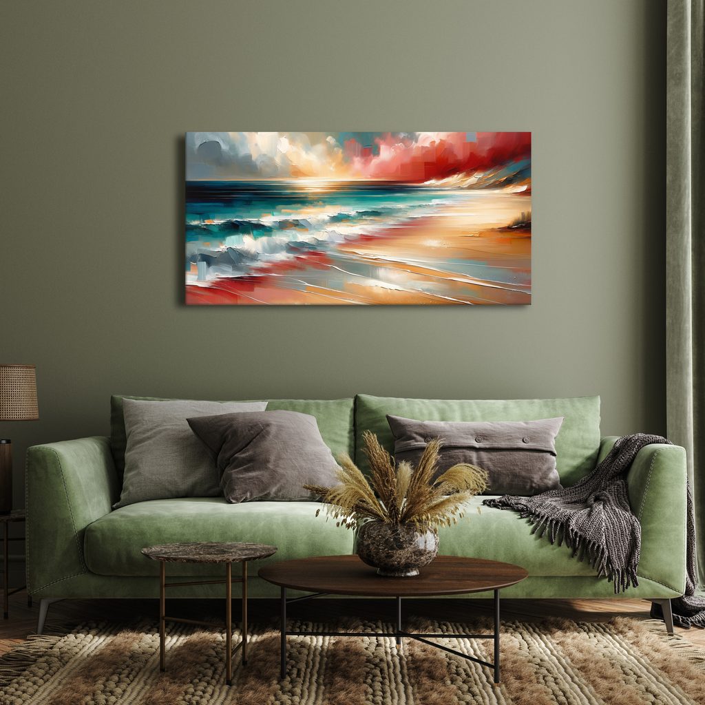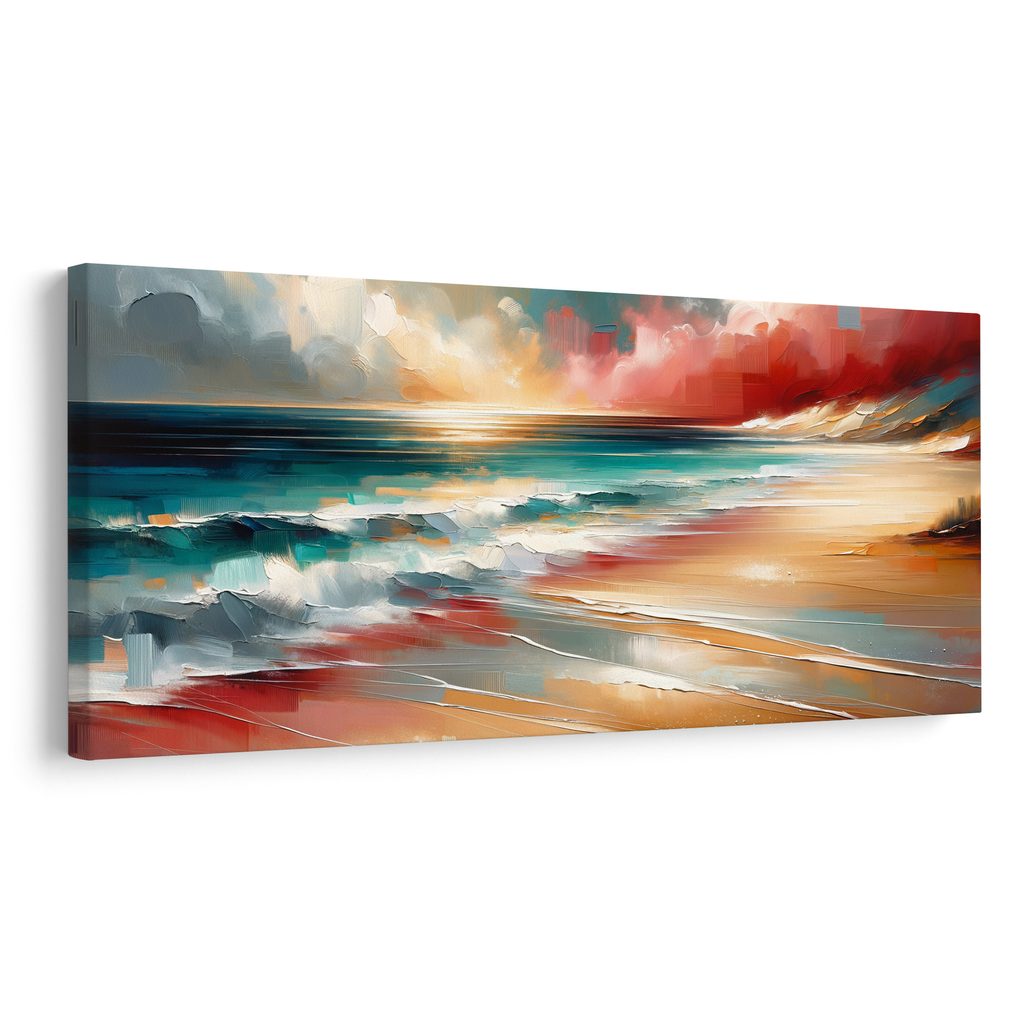Obraz vln tříštících se o pobřeží zachycuje kouzlo mořské scenérie. Dynamické vlny a klidné písečné pláže vytvářejí harmonickou kompozici. Teplé odstíny oranžové a modré barvy evokují pocit pohody a relaxace. Tento obraz je ideální pro oživení interiéru, ať už v obývacím pokoji nebo ložnici. Vysoce kvalitní tisk zajišťuje živé barvy a dlouhou životnost produktu.