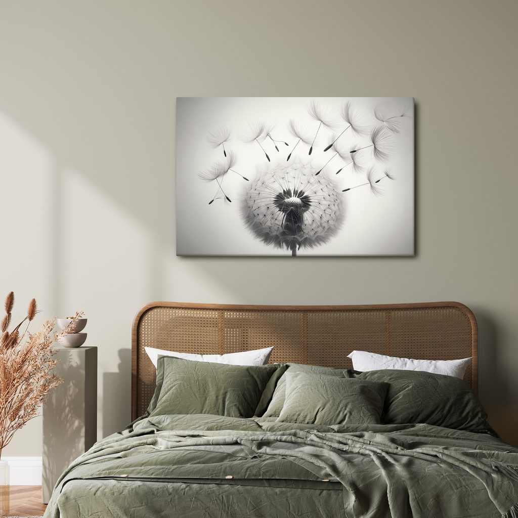 Obraz černobílé pampelišky zobrazuje jemný detail této krásné rostliny s jejími nadýchanými semeny. Pampeliška je zachycena v momentě, kdy se její semena odnášejí větrem, což vytváří pocit pohybu a lehkosti. Černobílá paleta dodává obrazu elegantní a nadčasový vzhled, ideální pro každý interiér. Tento obraz skvěle doplní vaše bydlení nebo kancelář a přinese do prostoru klidnou atmosféru. Vysoce kvalitní tisk zaručuje dlouhou životnost a živost detailů.