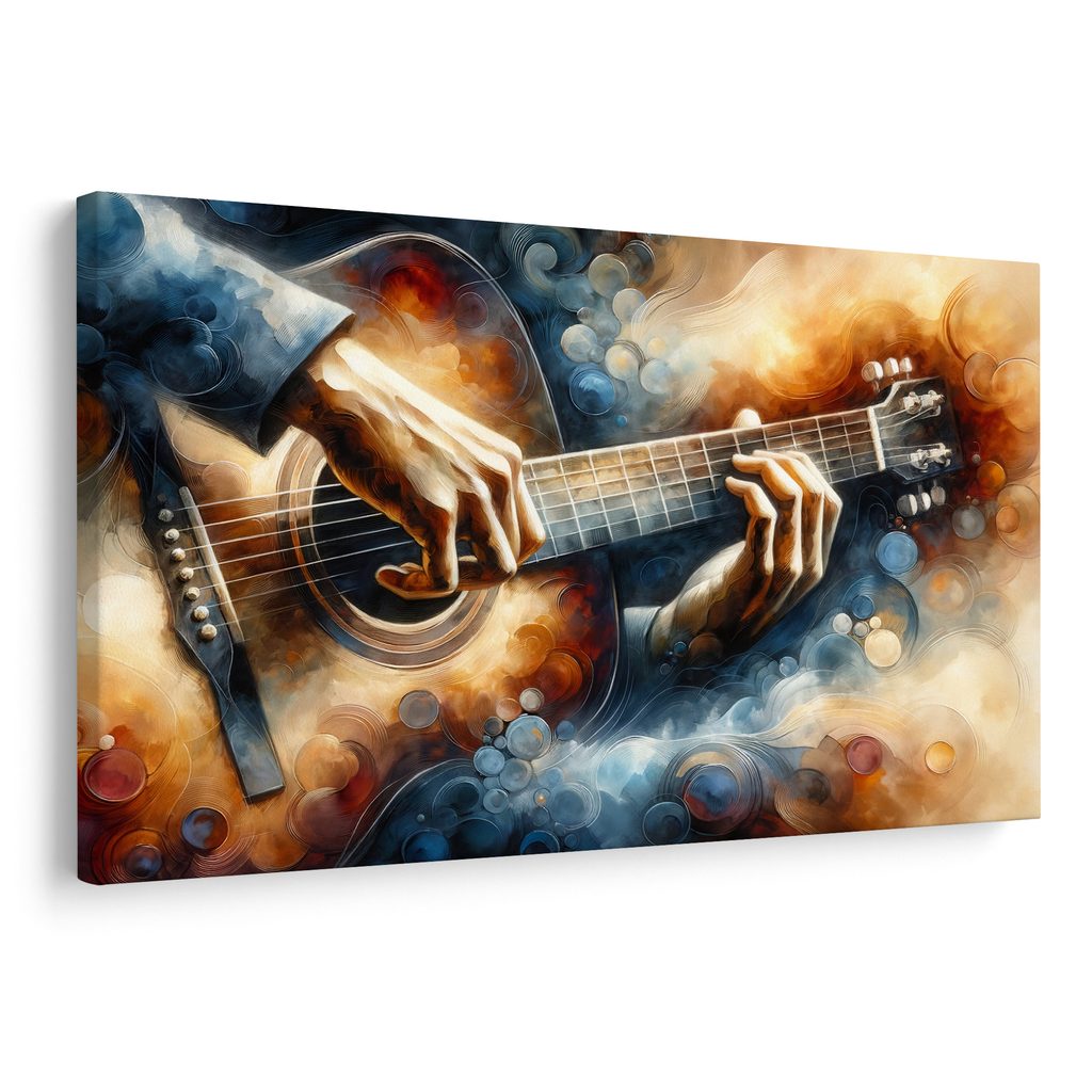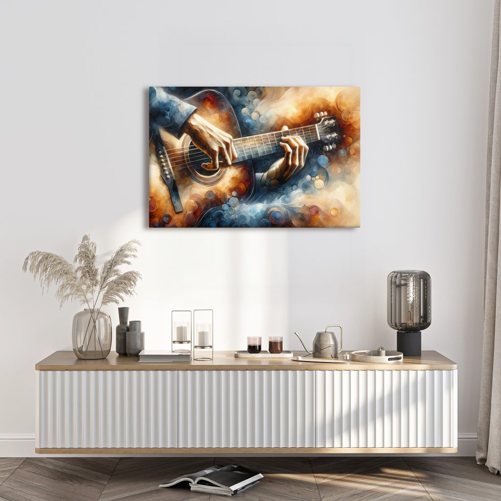 Obraz hudební vášeň zachycuje dynamiku hry na kytaru. Detailní zobrazení rukou na kytaře doplňuje barevná hra s jemnými odstíny modré, hnědé a oranžové, které vytvářejí emotivní atmosféru. Tento motiv evokuje vášeň a kreativitu, ideální pro milovníky hudby a umění. Skvěle se hodí do obývacího pokoje, pracovny nebo hudebního studia. Obraz je vytištěn na kvalitním plátně, které zajistí dlouhou životnost a výraznou barevnost.