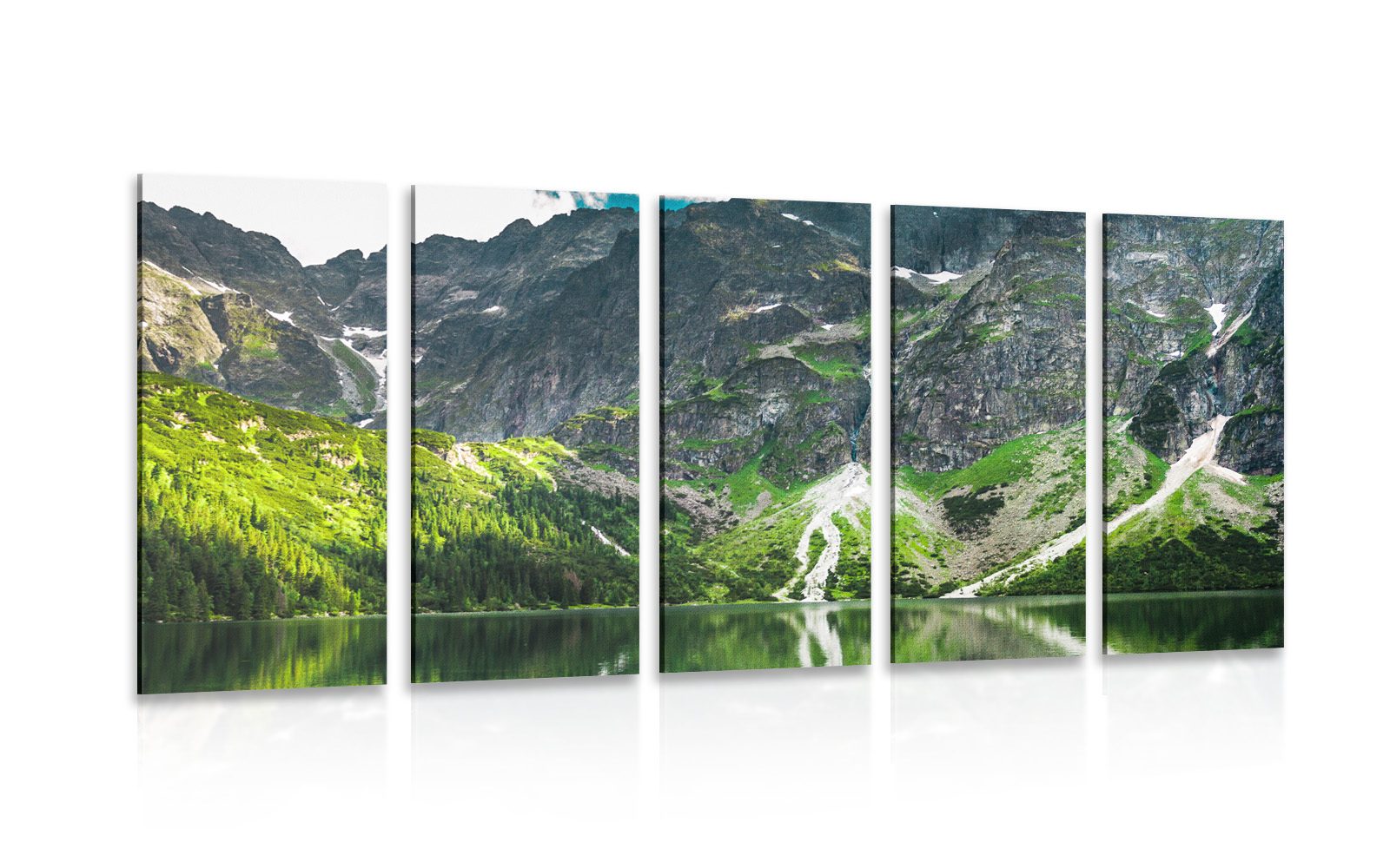 Pětidílný obraz Mořské oko v Tatrách zachycuje nádhernou horskou scenérii s jezerem obklopeným majestátními horami. Detaily přírody, jako jsou zelené lesy a skalní útvary, vytvářejí harmonický a uklidňující pohled. Barvy jsou svěží a živé, s dominantními zelenými a šedými tóny, které evokují klid a přírodní krásu. Tento obraz je ideální pro oživení interiéru v obývacím pokoji nebo kanceláři. Vysoce kvalitní tisk zaručuje dlouhou životnost a jasnost barev, což z něj činí skvělou volbu pro milovníky přírody.