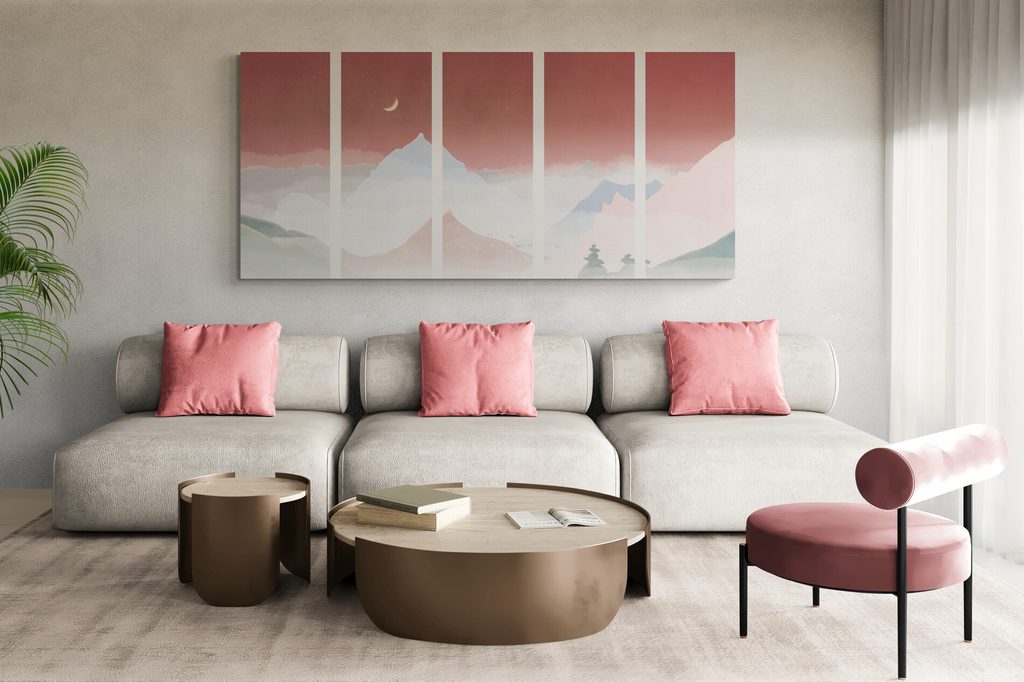 Tento 5-dílný obraz zachycuje kouzelný měsíc nad pastelovými horami. Jemné detaily horské krajiny v kombinaci s klidnou atmosférou vytvářejí harmonický pohled. Barevná paleta v pastelových odstínech růžové a modré dodává celému dílu lehkost a útulnost. Tento obraz je ideální pro zkrášlení obývacích pokojů nebo ložnic, přináší do prostoru pocit klidu. Obraz je vyroben z kvalitního materiálu, který zaručuje dlouhou životnost a snadnou údržbu.