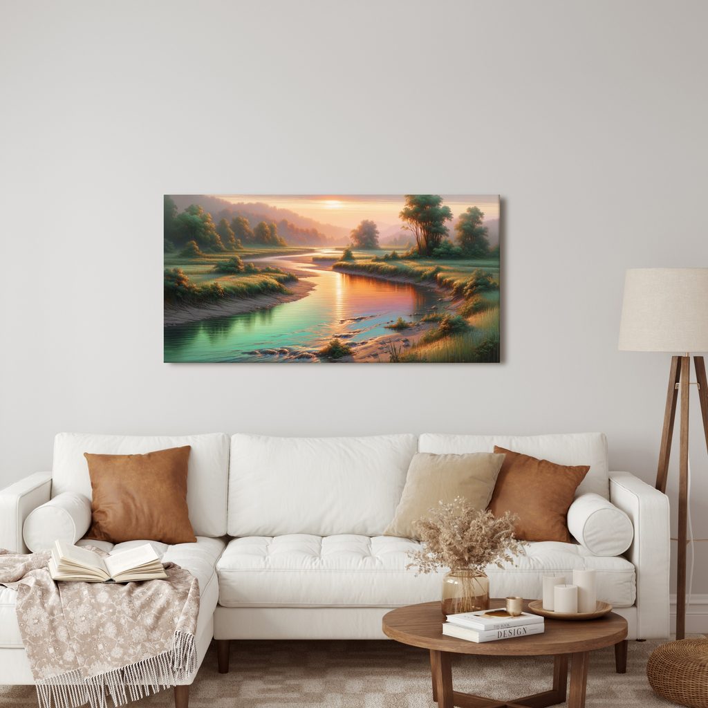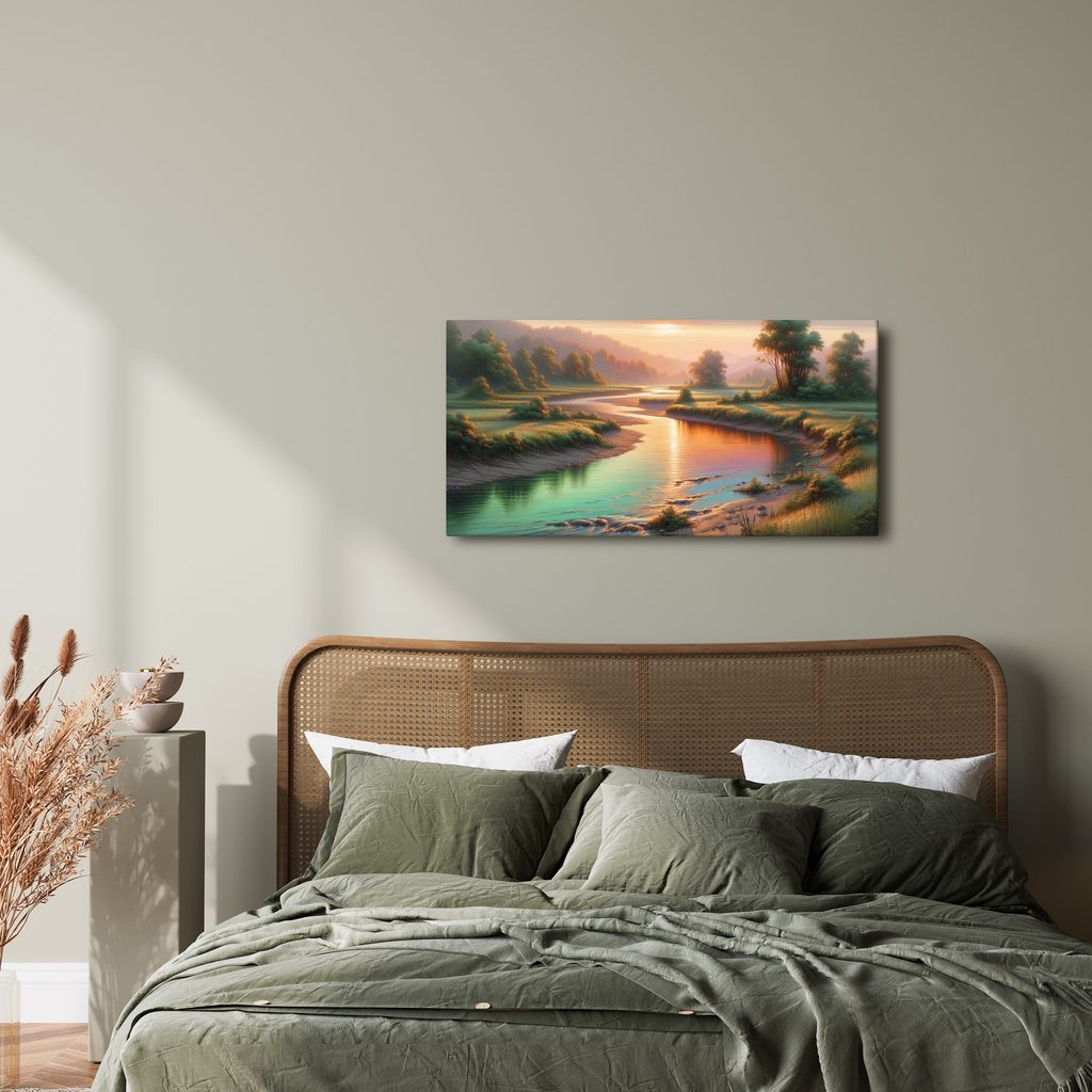 Obraz klidná hladina zachycuje malebnou scenérii řeky s poklidnou vodní hladinou. V popředí se nachází klidná řeka obklopená zelenými břehy a stromy, zatímco v pozadí se rozprostírá jemný horizont. Teplé odstíny oranžové a zelené barvy vytvářejí harmonickou a uklidňující atmosféru. Tento obraz je ideální pro zútulnění interiéru a dodání pocitu klidu a pohody. Obraz je vytištěn na kvalitním plátně, což zaručuje dlouhou životnost a živé barvy.