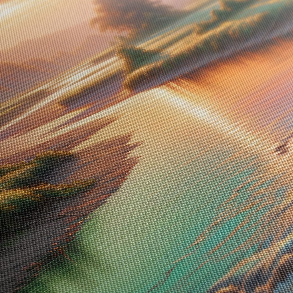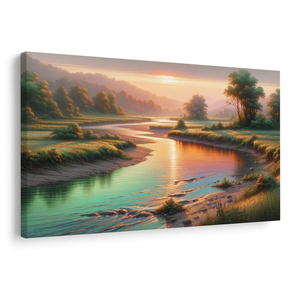 Tento obraz zachycuje klidnou řeku v podvečerním světle, obklopenou bujnou přírodou. Detaily zahrnují jemně se vlnící vodu, zelené břehy a stromy, které vytvářejí harmonickou scenérii. Barvy jsou teplé a uklidňující, s odstíny oranžové a zelené, které evokují pocit pohody a klidu. Tento motiv je ideální pro zkrášlení obývacího pokoje nebo pracovny, přináší do interiéru přírodní krásu. Obraz je vytištěn na kvalitním plátně, což zajišťuje jeho dlouhou životnost a estetický vzhled.