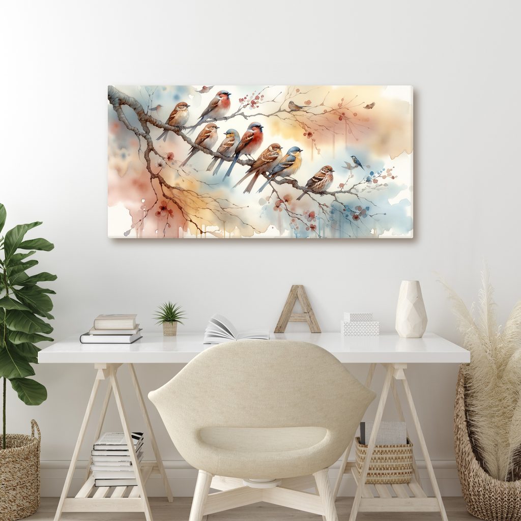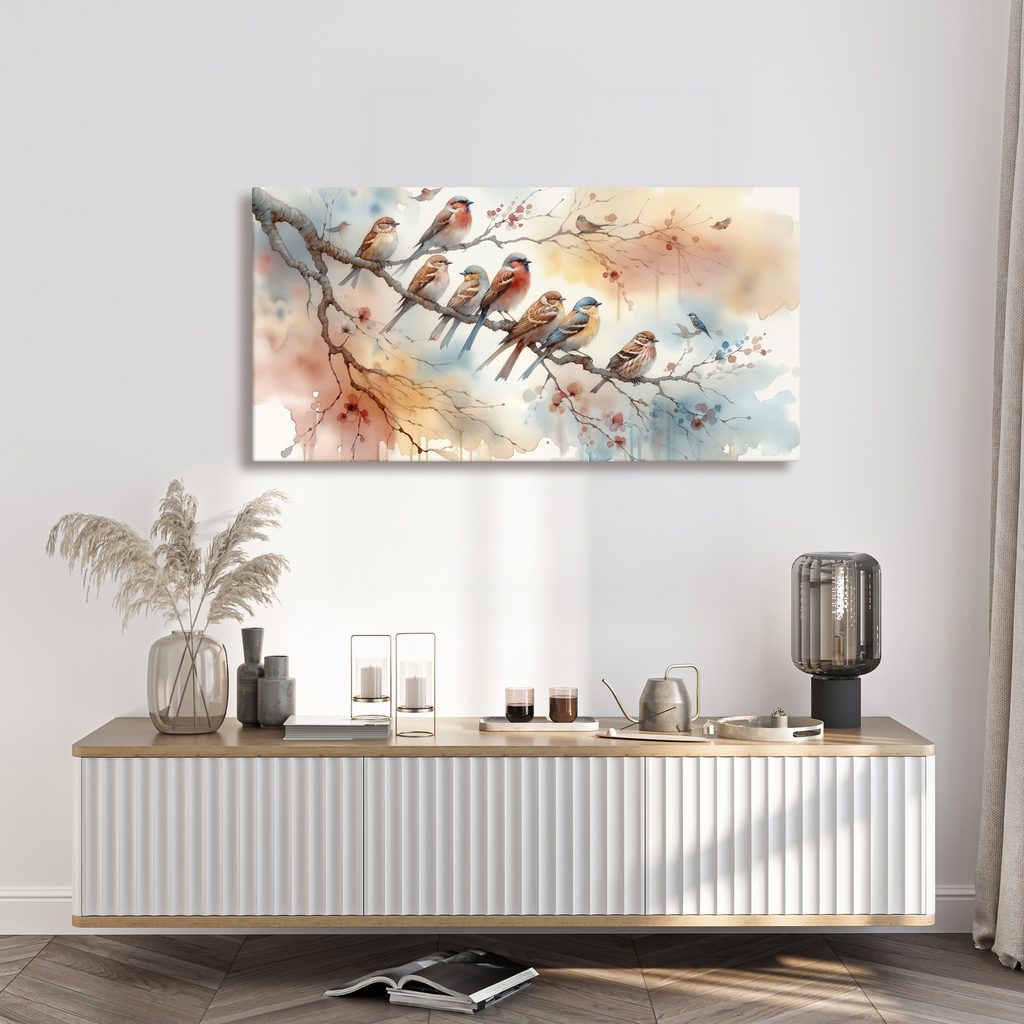 Obraz zobrazuje barevné ptáčky sedící na větvi. Na větvi se nachází několik různých druhů ptáků, každý s unikátními barvami a vzory. Dominantní barvy zahrnují jemné odstíny modré, červené a hnědé, které vytvářejí klidnou a harmonickou atmosféru. Tento obraz je ideální pro oživení jakéhokoli interiéru, ať už v obývacím pokoji, pracovně nebo dětském pokoji. Obraz je vytištěn na kvalitním plátně, což zaručuje dlouhou životnost a jasnost barev.