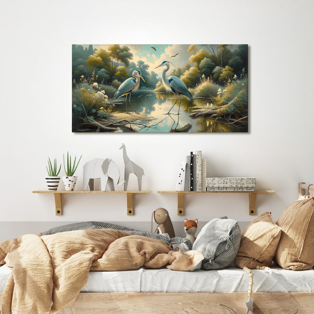 Obraz modré volavky zachycuje dvě elegantní ptáky stojící na břehu klidného rybníka. Detaily jako jemné vlnky na vodě a okolní příroda dodávají scéně harmonii a klid. Dominují zde jemné modré a zelené odstíny, které vytvářejí příjemnou atmosféru. Tento obraz se skvěle hodí do obývacího pokoje nebo pracovny, kde navodí pocit pohody. Kvalitní tisk a pečlivé zpracování zaručují dlouhou životnost a estetickou hodnotu.