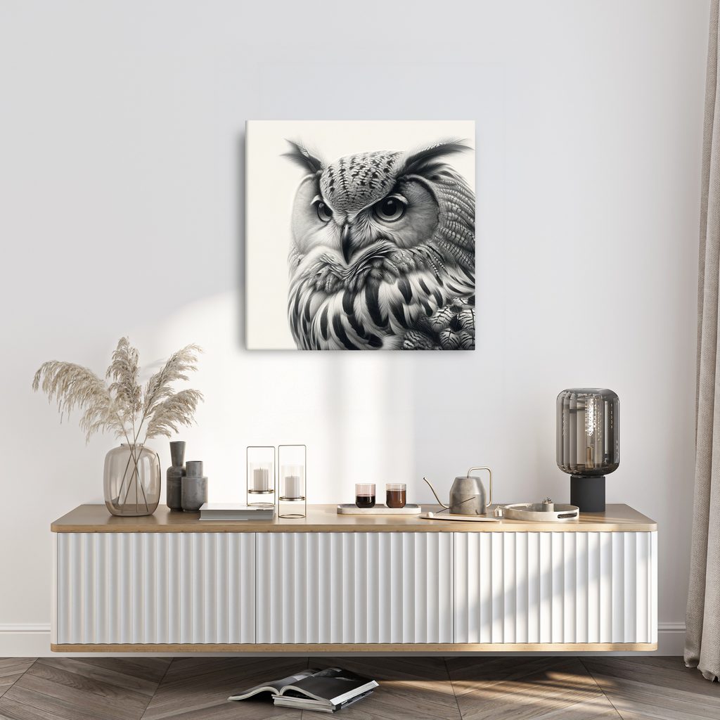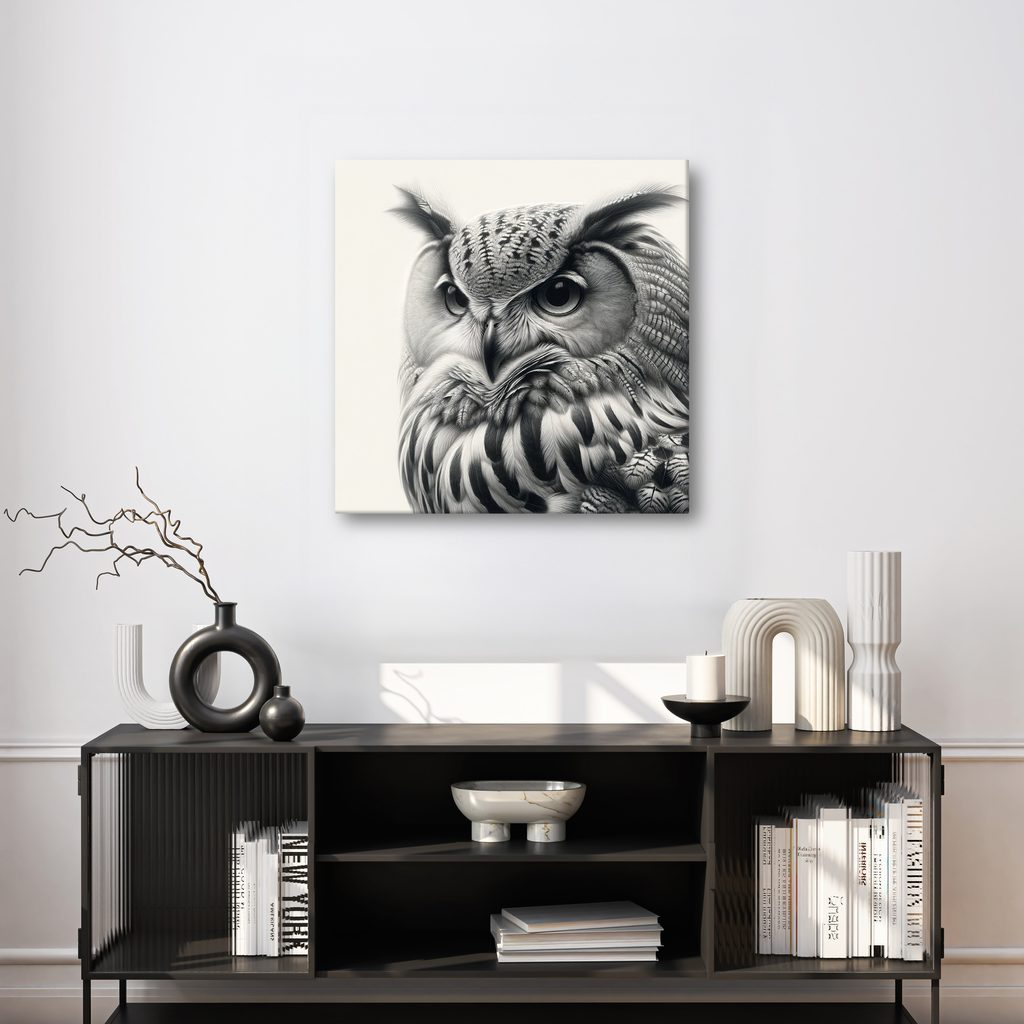 Realistický portrét sovy zachycuje fascinující detaily a výrazné rysy tohoto majestátního ptáka. Každé peří a oko je precizně zobrazeno, což umocňuje jeho inteligentní a tajemnou povahu. Černobílá paleta dodává obrazu elegantní a nadčasový vzhled, ideální pro moderní i tradiční interiéry. Tento obraz je skvělou volbou pro milovníky přírody a umění, kteří chtějí vnést do svého prostoru kousek divoké krásy. Vyrobeno s důrazem na kvalitu, tento obraz zaručuje dlouhou životnost a trvalou radost.
