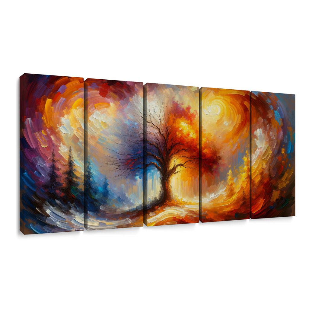Tento 5-dílný obraz zobrazuje fascinující motiv stromu života ve hřejivých odstínech ohně. Hlavní prvek tvoří majestátní strom, jehož větve jsou obklopeny živými barvami, které přecházejí od teplých červených a oranžových tónů po chladnější modré. Atmosféra je dynamická a energická, evokující pocit života a transformace. Tento obraz se skvěle hodí do obývacího pokoje nebo pracovny, kde povzbudí kreativitu a pozitivní energii. Vyrobený z kvalitních materiálů, zaručuje dlouhou životnost a snadnou údržbu.