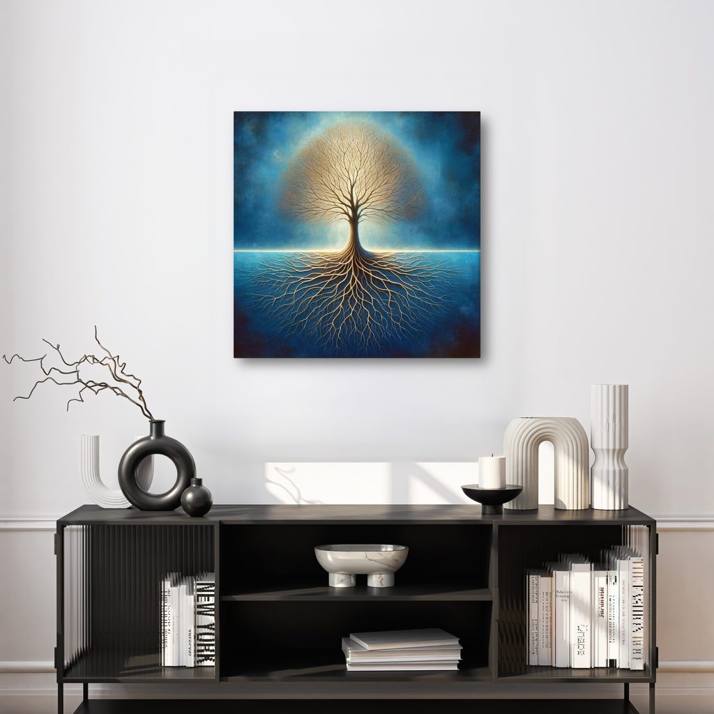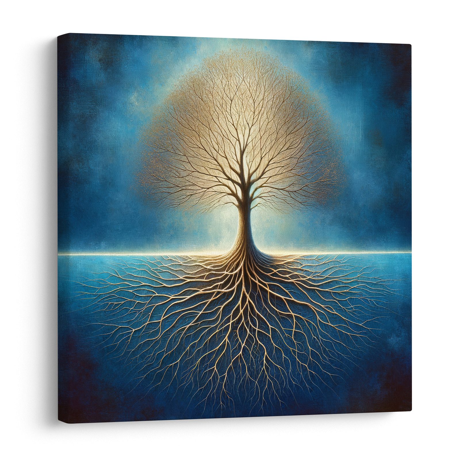 Obraz s motivem kořenů stromu života přináší jedinečnou harmonii přírody do vašeho interiéru. Detaily kořenového systému a proplétající se větve vytvářejí fascinující kompozici, která upoutá pozornost. Teplé zlaté a chladné modré odstíny dodávají obrazu hloubku a tajemnou atmosféru. Tento obraz je ideální pro obývací pokoje, kanceláře nebo jako originální dárek. Vyroben s důrazem na kvalitu, tento obraz zaručuje dlouhou životnost a estetické potěšení.